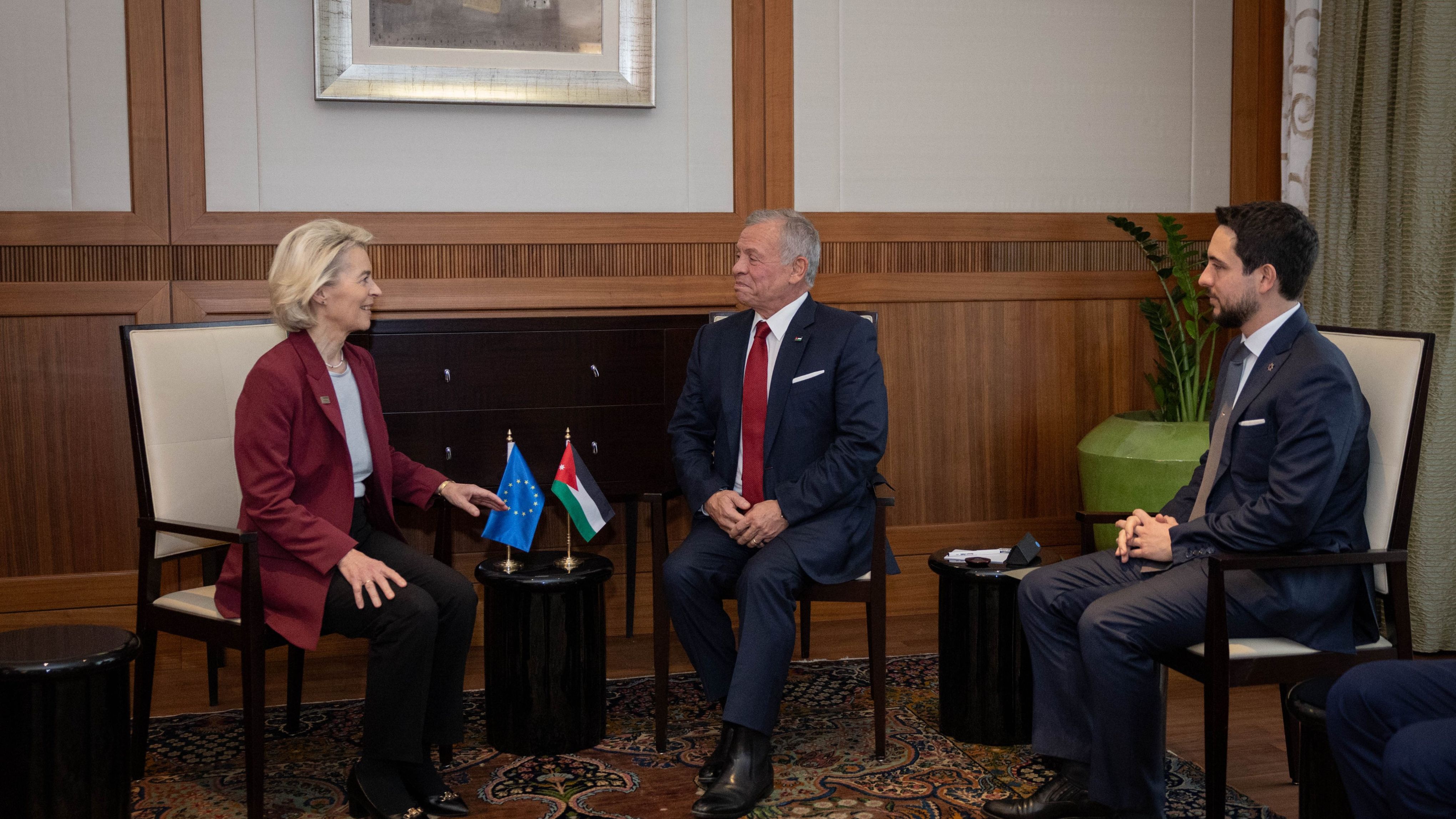 وأشار جلالته خلال لقائه مع رئيسة المفوضية الأوروبية، إلى أهمية إدامة التنسيق مع الاتحاد الأوروبي حيال المستجدات في المنطقة، بما يخدم المصالح المشتركة ويحقق الأمن والاستقرار.
