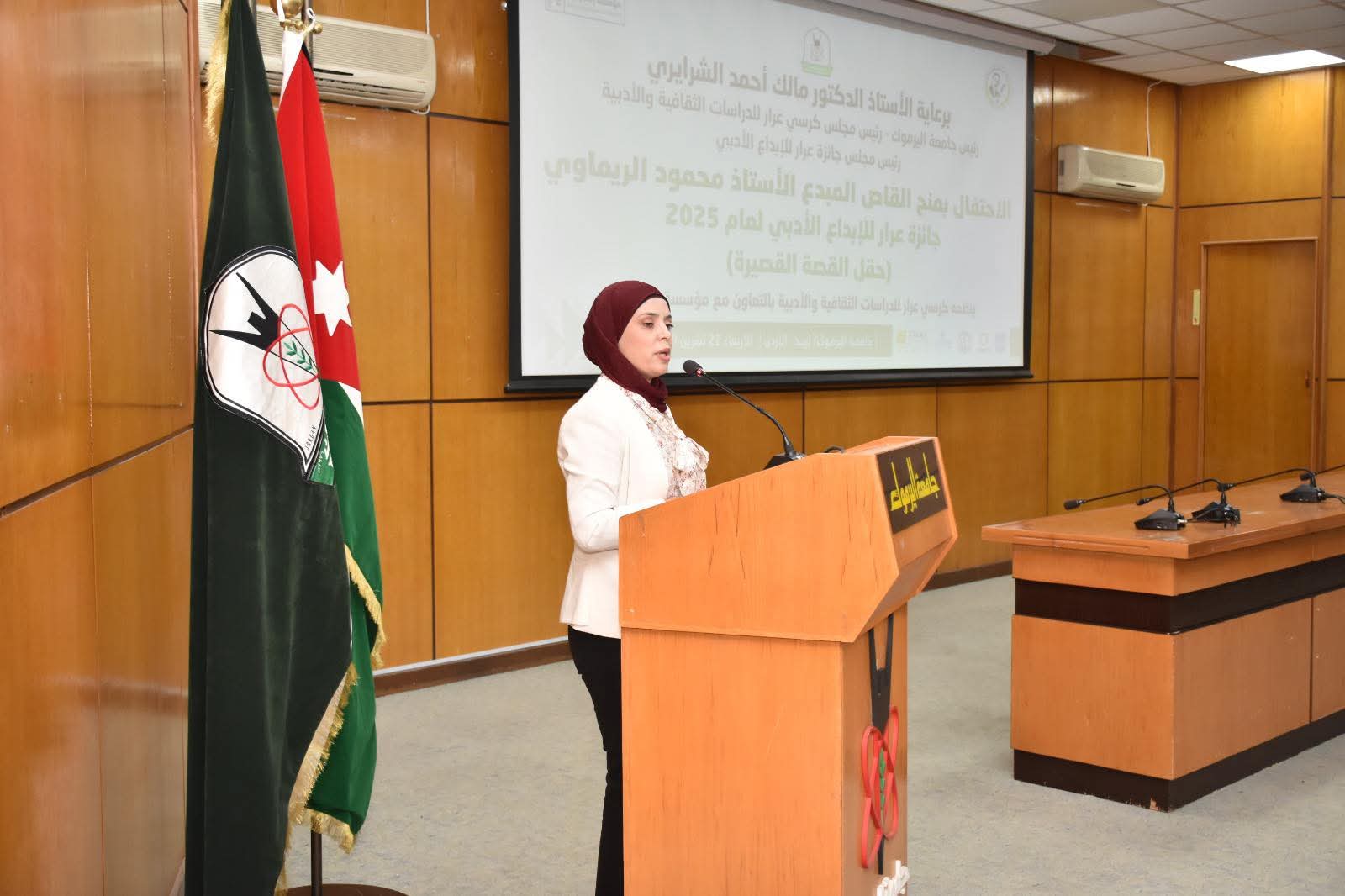 شاغل كرسي عرار الدكتورة ليندا عبيد، قالت في كلمتها إننا جئنا نحتفي اليوم بجائزة عرار للإبداع الثقافي التي دأب كرسي عرار بالتعاون مع مؤسسة إعمار إربد على منحها كل عام لمبدع قدم الكثير للأدب الأردني، حيث منحت في دورتها الأولى في حقل الشعر للشاعر حيدر محمود، وفي مجال المقالة الأدبية للدكتور خالد الكركي، وفي مجال الشعر مرة أخرى للمرحوم الشاعر محمود فضيل التل، ثم في الرواية للروائي محمود موسى، لافتة إلى أنه وفي هذا العام تم اختيار فن القصة القصيرة التي تعد من أحدث الأجناس الأدبية في الكتابة السردية.