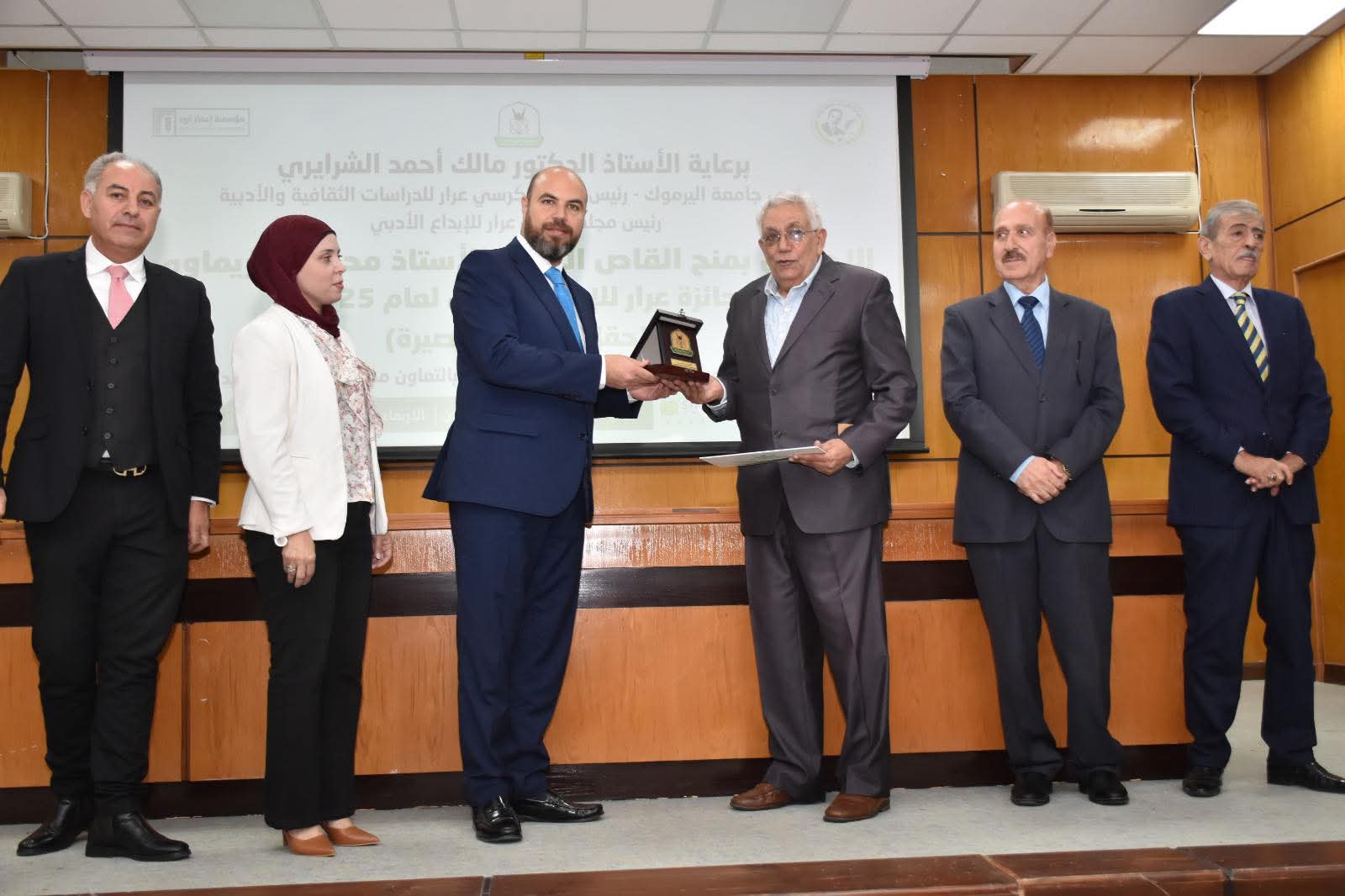 وسلم راعي الحفل الشرايري بحضور شاغل كرسي عرار الدكتورة ليندا عبيد ومدير مؤسسة الأعمار المهندس منذر بطاينة الدرع التكريمي وجائزة عرار للإبداع الأدبي للقاص الريماوي.