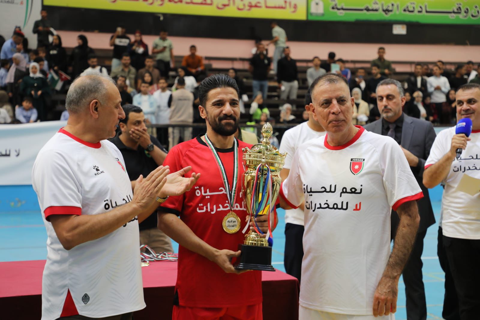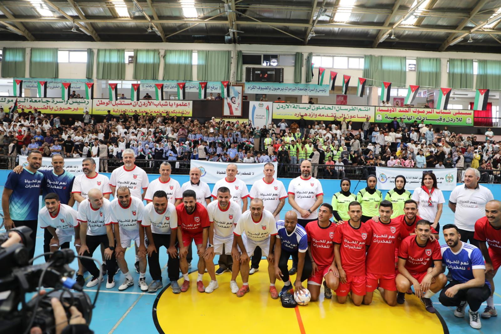 وتخلل الحفل مباراة ودية جمعت بين لاعبي المنتخب الوطني القدامى والحاليين، أقيمت في أجواء مفعمة بالحماس والروح الرياضية، إيصالا لرسالة شبابية هادفة مفادها أن الرياضة طريق للحياة... لا للمخدرات.