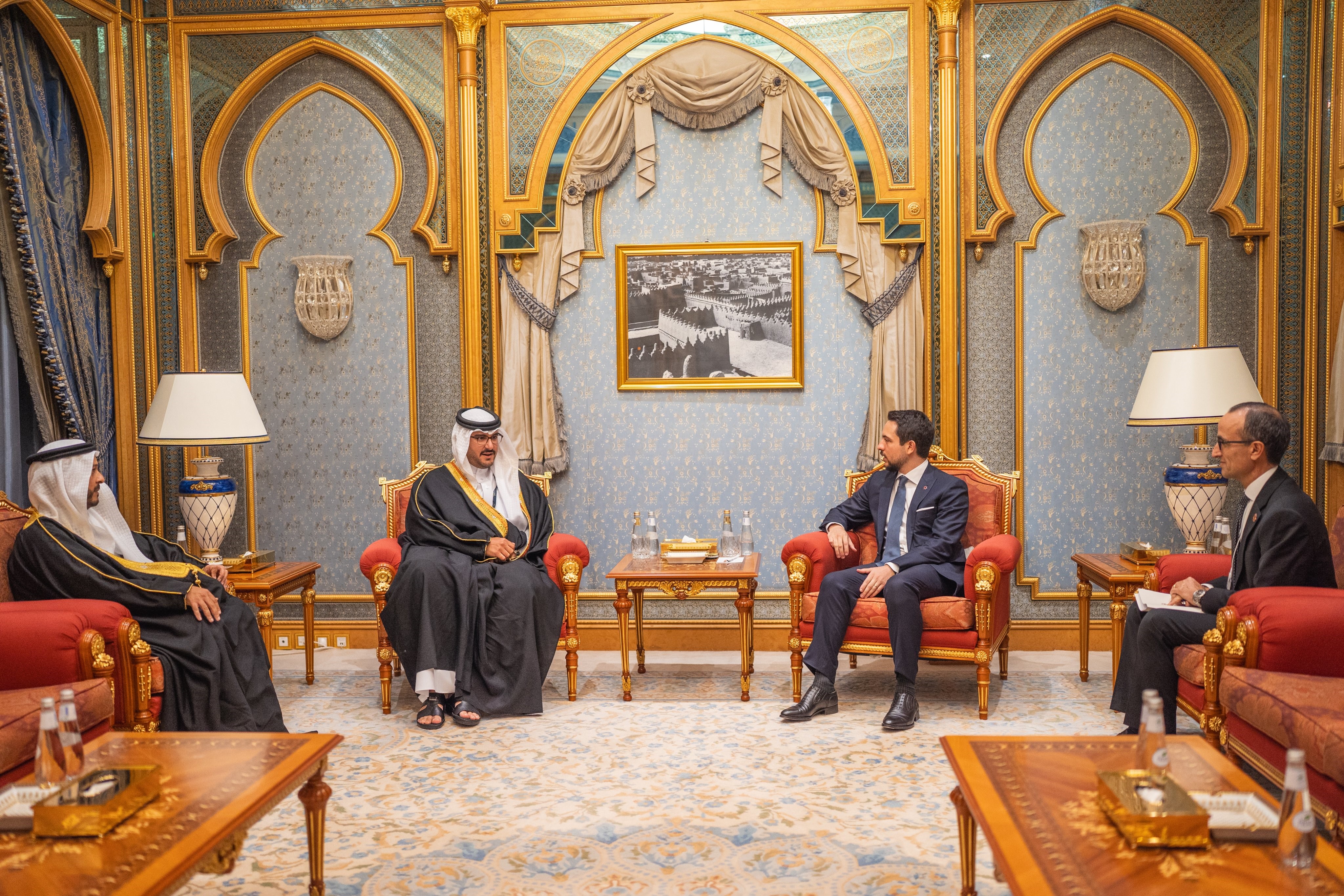 عمان جو - التقى سمو الأمير الحسين بن عبدالله الثاني ولي العهد، اليوم الثلاثاء، بسمو الشيخ عيسى بن سلمان بن حمد آل خليفة وزير ديوان رئيس مجلس الوزراء، رئيس وفد مملكة البحرين المشارك في مؤتمر مبادرة مستقبل الاستثمار المنعقد في الرياض.