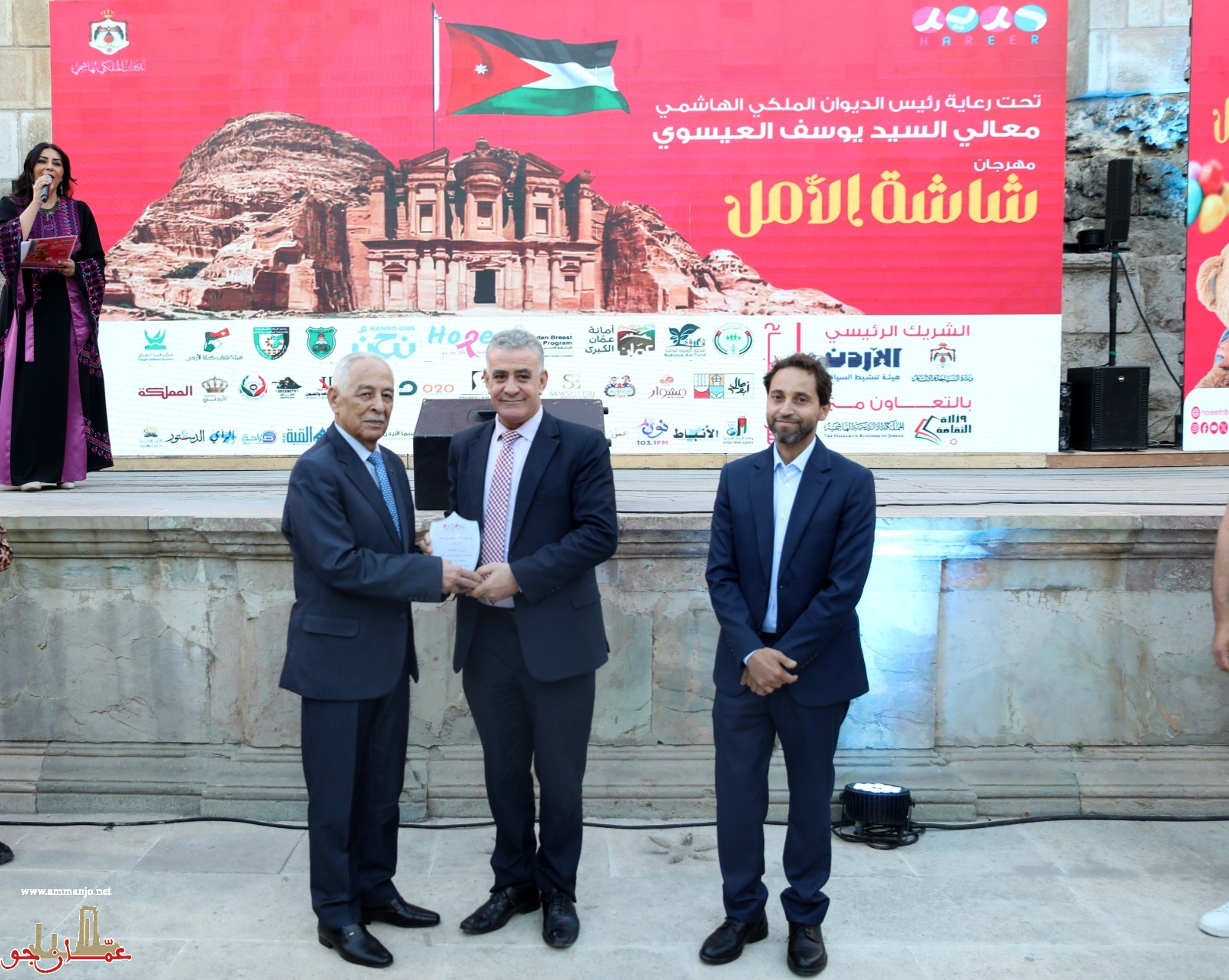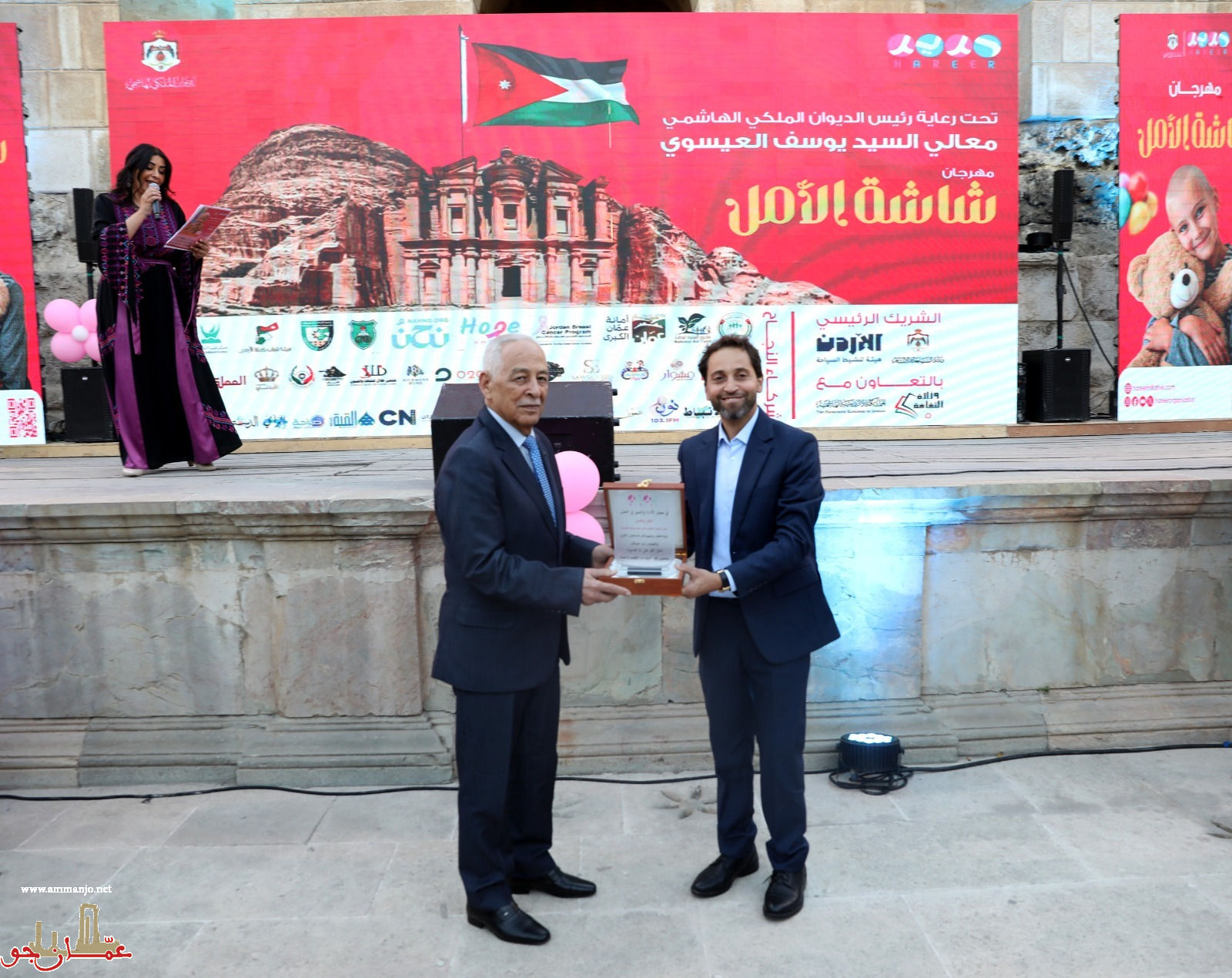 عمان جو - رعى رئيس الديوان الملكي الهاشمي يوسف حسن العيسوي، اليوم الجمعة، على مسرح الأوديون في وسط العاصمة عمّان، انطلاق فعاليات مبادرة "شاشة أمل" الإنسانية التي تنظمها مؤسسة حرير للتنمية المجتمعية، والموجهة للأطفال المرضى والأيتام واللاجئين في مختلف محافظات المملكة وأبناء غزة المقمين في الأردن، وتستمر على مدار يومين.