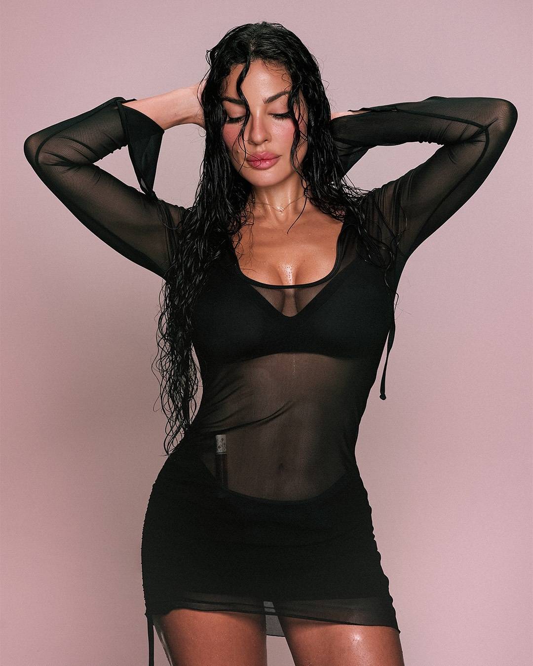 واختارت النجمة اللبنانية فستاناً جريئاً من قماش الشيفون الشفّاف باللون الأسود وجاء بتصميم مجسّم وقصير، وبأكمام طويلة وواسعة عند الأطراف، وارتدت تحته ملابس داخلية مع تنورة سوداء قصيرة. واستعرضت من خلال الصور جسمها الممشوق وبطنها المقطعة.