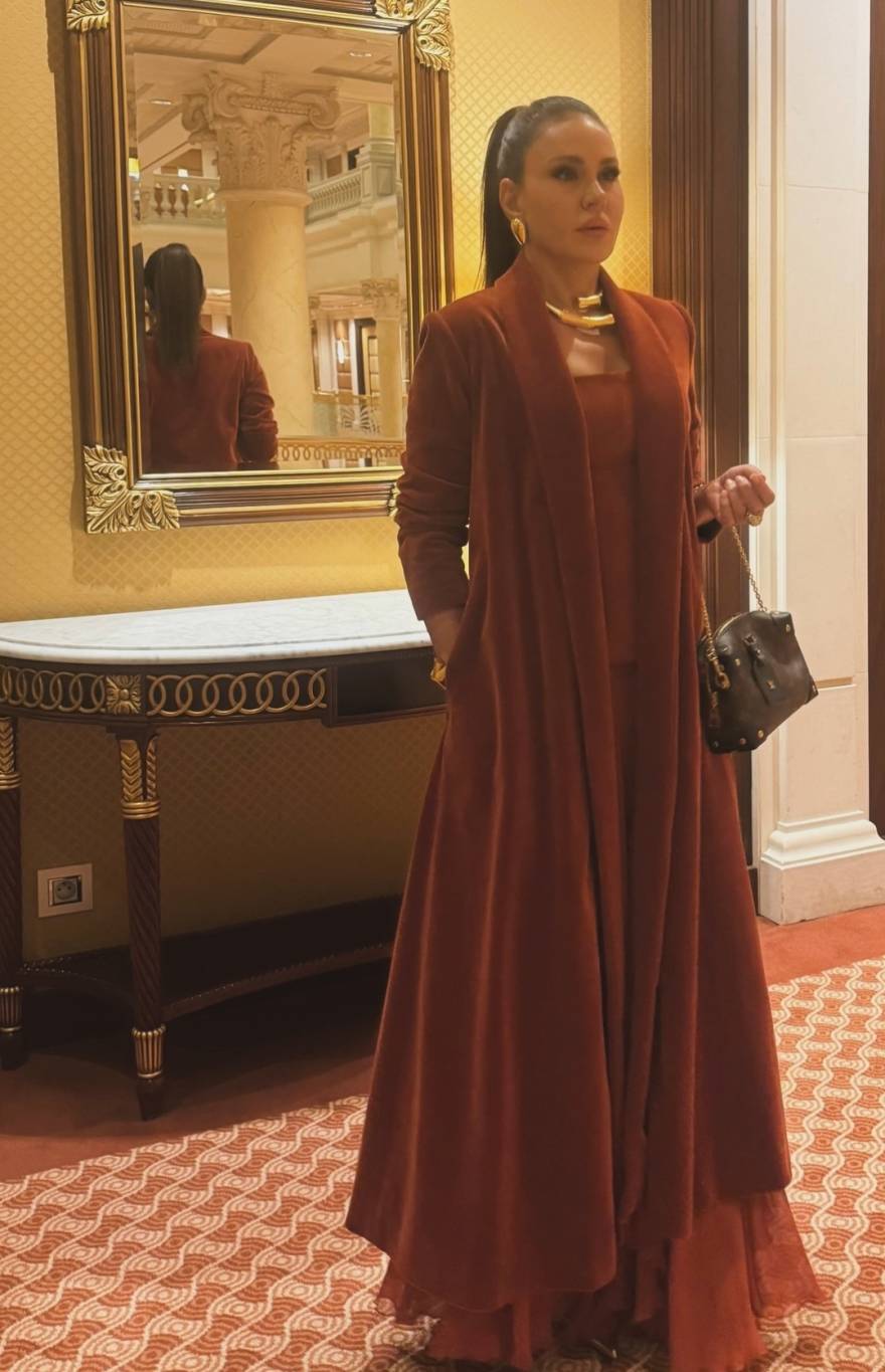 واختارت النجمة السورية اطلالتها من كارولين لانغ باللون "البريك" Brique، عبارة عن فستان طويل وواسع من المخمل الفخم بتصميم انسيابي مريح، وجاء فوقه معطفاً طويلاً مستوحى من طابع العباية الشرقية الكلاسيكية بقصة ناعمة وبتفصيل الياقة العريضة.
