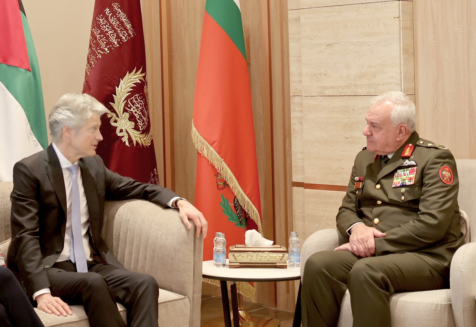 عمان جو_استقبل رئيس هيئة الأركان المشتركة اللواء الركن يوسف أحمد الحنيطي، في مكتبه بالقيادة العامة، اليوم الثلاثاء، المدير العام للسياسة الأمنية والدفاعية في وزارة الدفاع الألمانية "جاسبرويك"والوفد المرافق.
