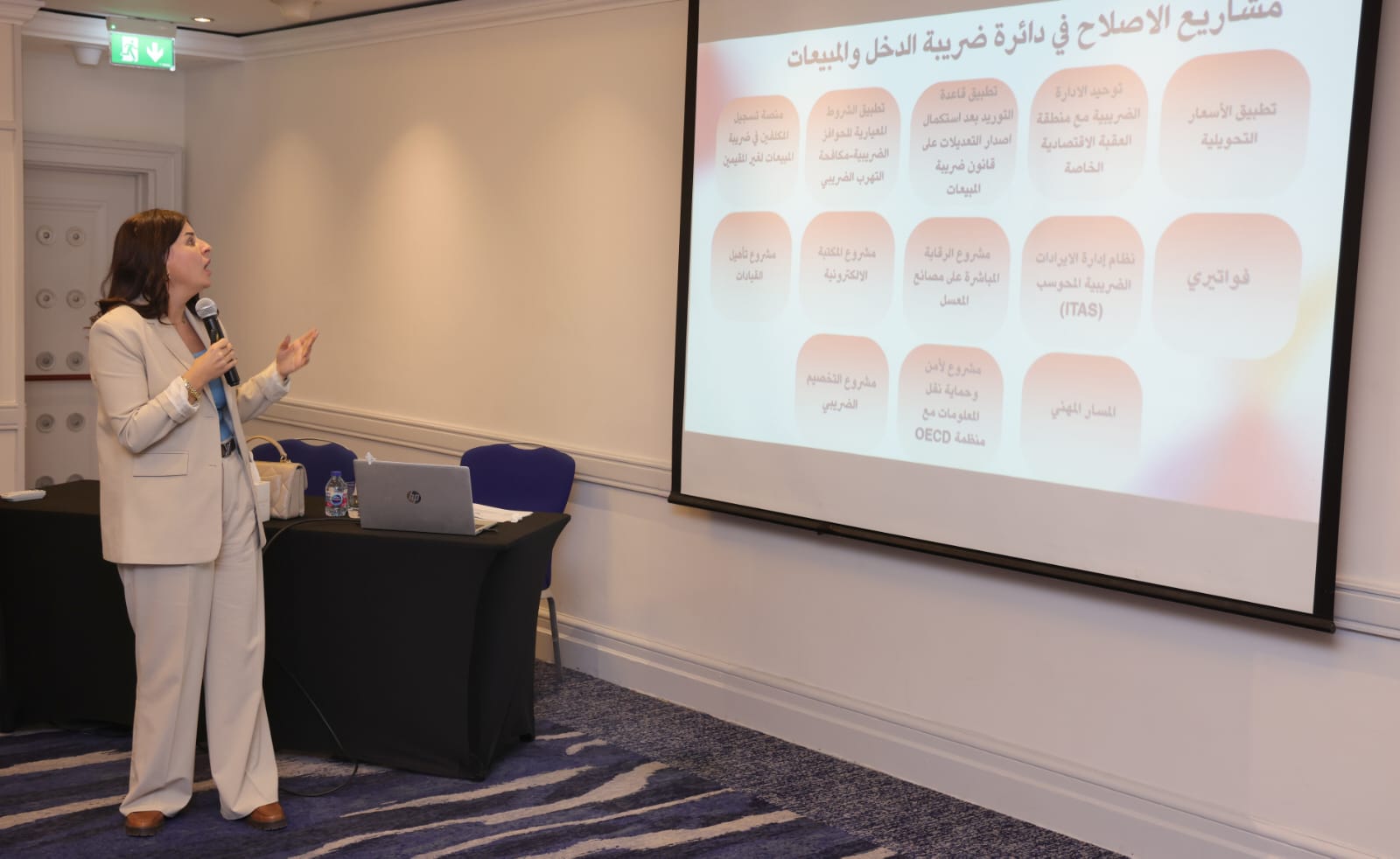 كما قامت عكروش باستعراض الأهداف الاستراتيجية الحالية، التي تركز على إدارة وتنظيم العمل الضريبي بكفاءة لضمان رفد الخزينة بالإيرادات، وتعزيز الالتزام الطوعي، وتطوير الكفاءات البشرية والبنية التحتية المؤسسية.
