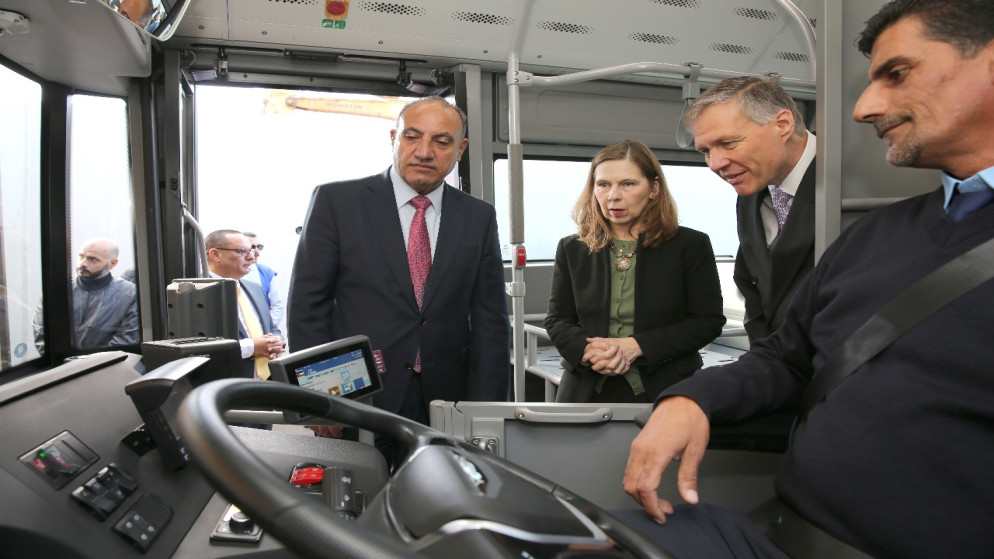 عمان جو_تفقد رئيس لجنة أمانة عمان الكبرى يوسف الشواربة ، الأحد، التشغيل التجريبي للحافلات الكهربائية الجديدة التي تم إطلاقها ضمن "المسار الأخضر" لمشروع الباص السريع، في محطة طارق، يرافقه السفير البريطاني لدى الأردن فيليب هول، والمديرة الإقليمية لمنطقة شرق المتوسط، البنك الأوروبي لإعادة الإعمار والتنمية ( EBRD ) غريتشن بيري.
