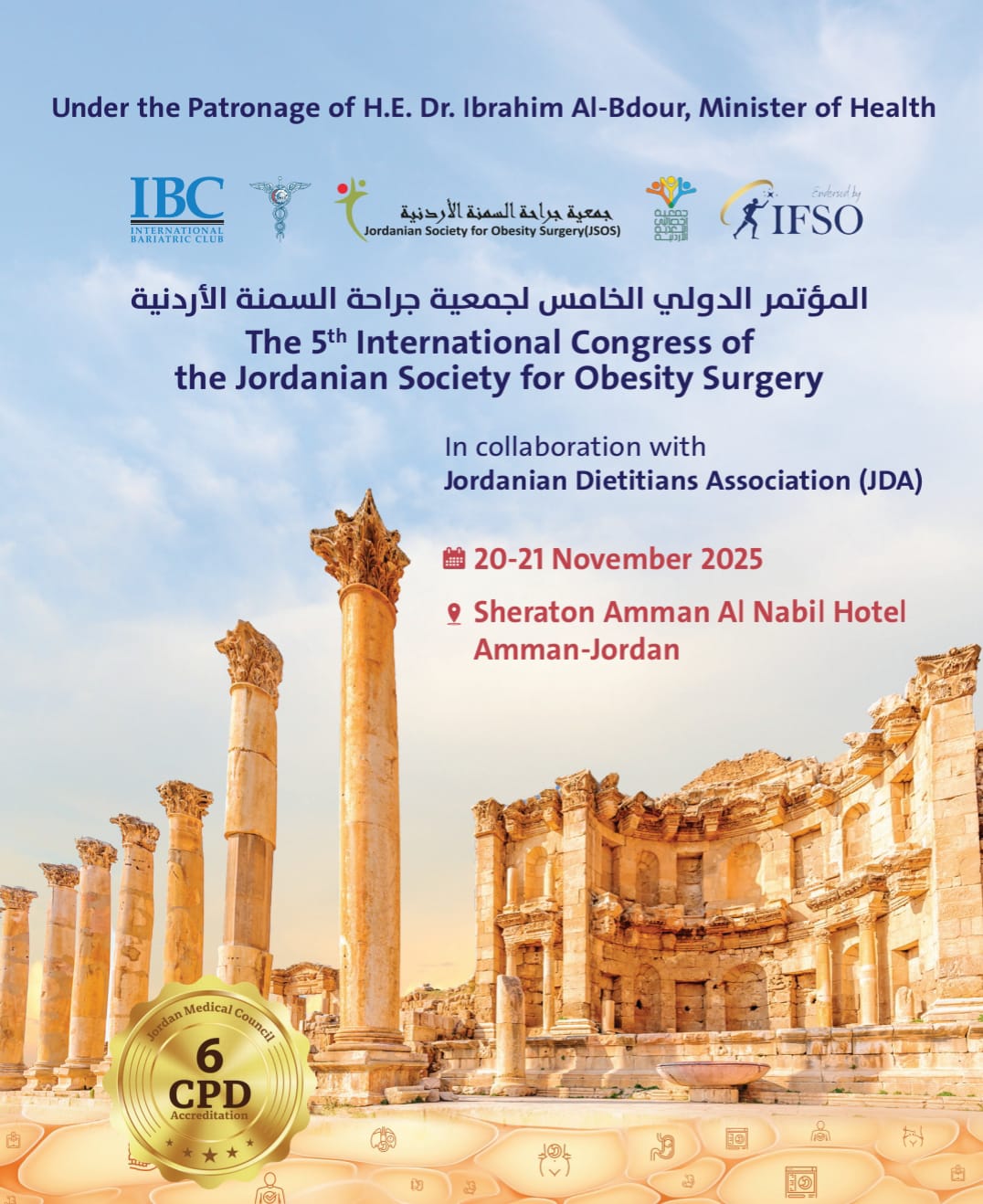يذكر أن المؤتمر معتمد من المجلس الطبي الأردني بواقع 6 ساعات للحضور و8 ساعات للمحاضرين لغايات التطوير المهني.