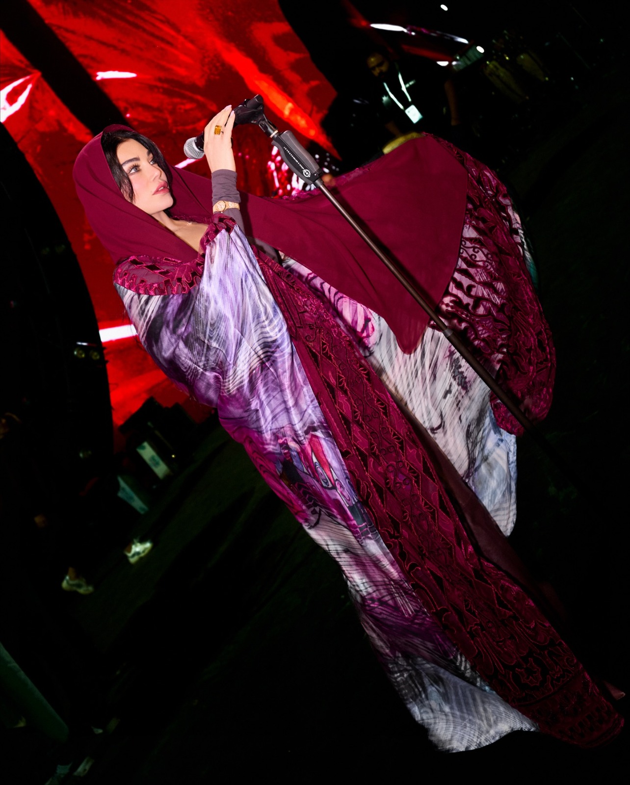 وأطلت بعباءة فخمة باللون القرمزي وغطاء رأس باللون نفسه، وانسدل شعرها الويفي من أسفل غطاء الرأس، في مظهر أضفى جاذبية لإطلالتها.