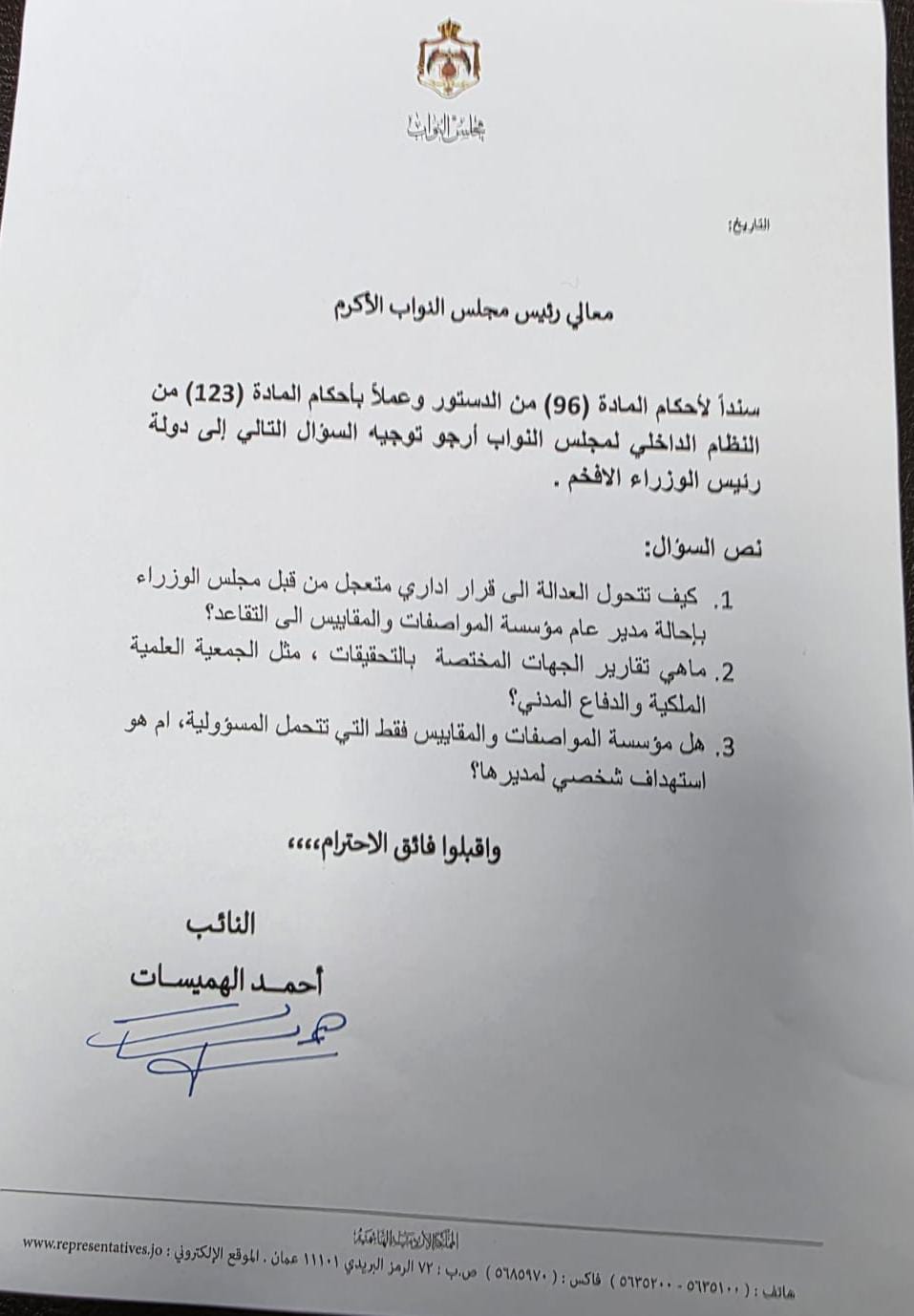 عمان جو-وجّه النائب أحمد الهميسات سؤالاً نيابياً إلى دولة رئيس الوزراء، استناداً لأحكام المادتين (96) من الدستور و(123) من النظام الداخلي لمجلس النواب، تساءل فيه عن الأسس القانونية والإدارية لإحالة مدير عام مؤسسة المواصفات والمقاييس إلى التقاعد بقرار إداري متعجّل من مجلس الوزراء.