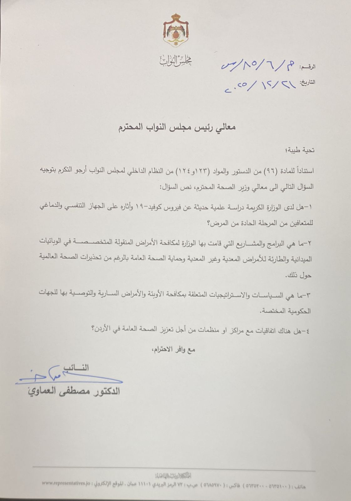 وطالب العماوي بتوضيح السياسات والاستراتيجيات الوطنية المتعلقة بمكافحة الأوبئة والأمراض السارية، ومدى التنسيق والتوصيات المقدّمة للجهات الحكومية المختصة، إضافة إلى الاستفسار عن وجود اتفاقيات مع مراكز أو منظمات دولية تهدف إلى تعزيز الصحة العامة في الأردن.