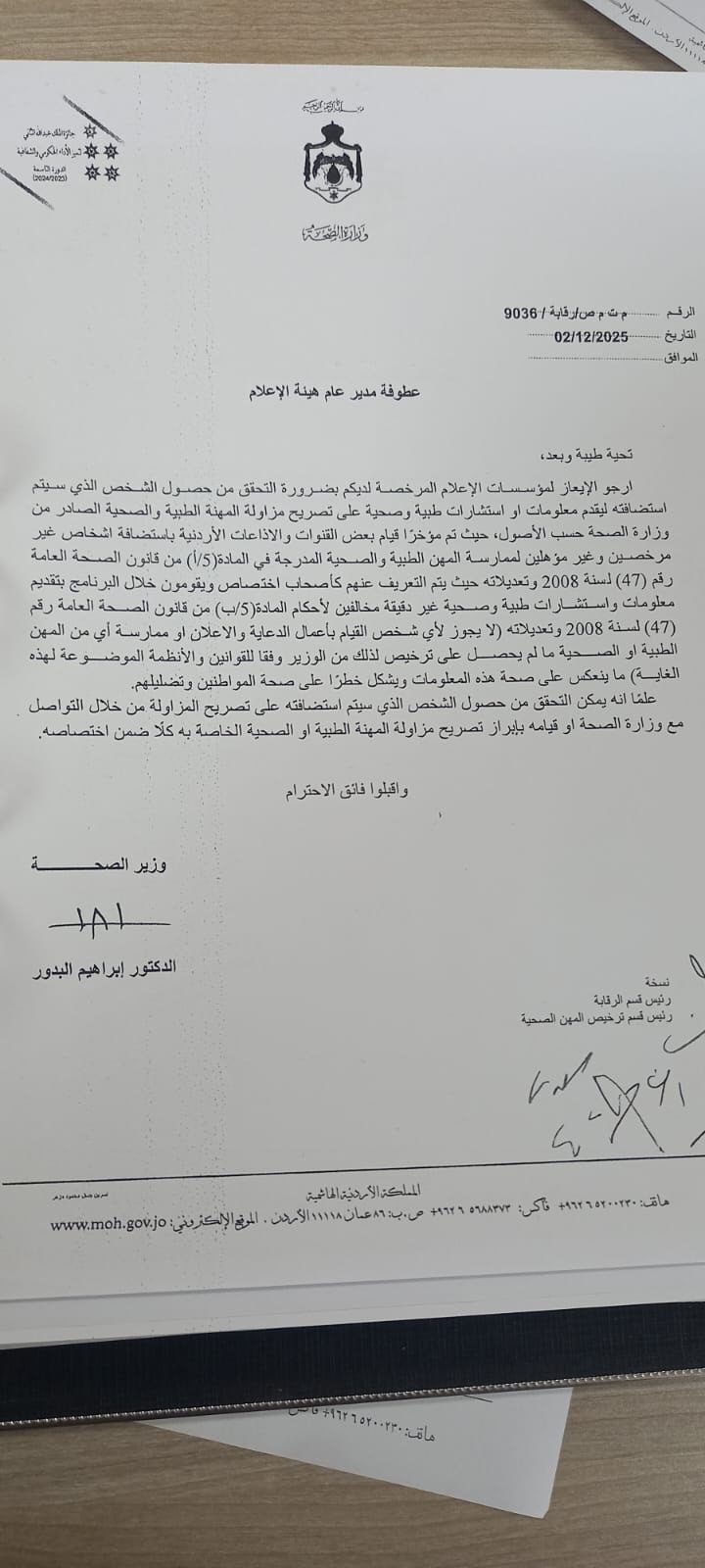 عمان جو - أحدث كتاب وزارة الصحة الأخير، الذي شدّد على ضرورة الالتزام بالقوانين عند تقديم أي معلومات طبية في وسائل الإعلام، صدى واسعًا بين الأطباء حملة البورد الأجنبي ومؤهلي الاختصاص العاملين في المستشفيات الحكومية.
