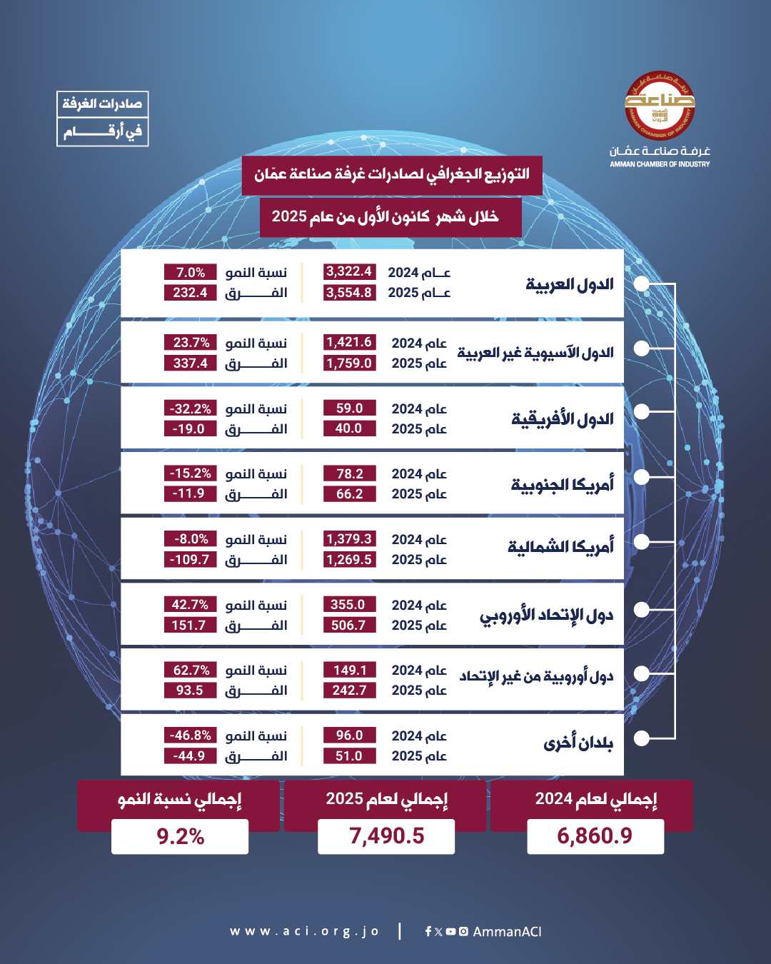 وحسب معطيات إحصائية للغرفة، حصلت عليها وكالة الأنباء الأردنية (بترا)، بلغت صادرات صناعة عمان خلال العام الماضي، 7.490 مليار دينار، مقابل 6.860 مليار دينار لعام 2024.