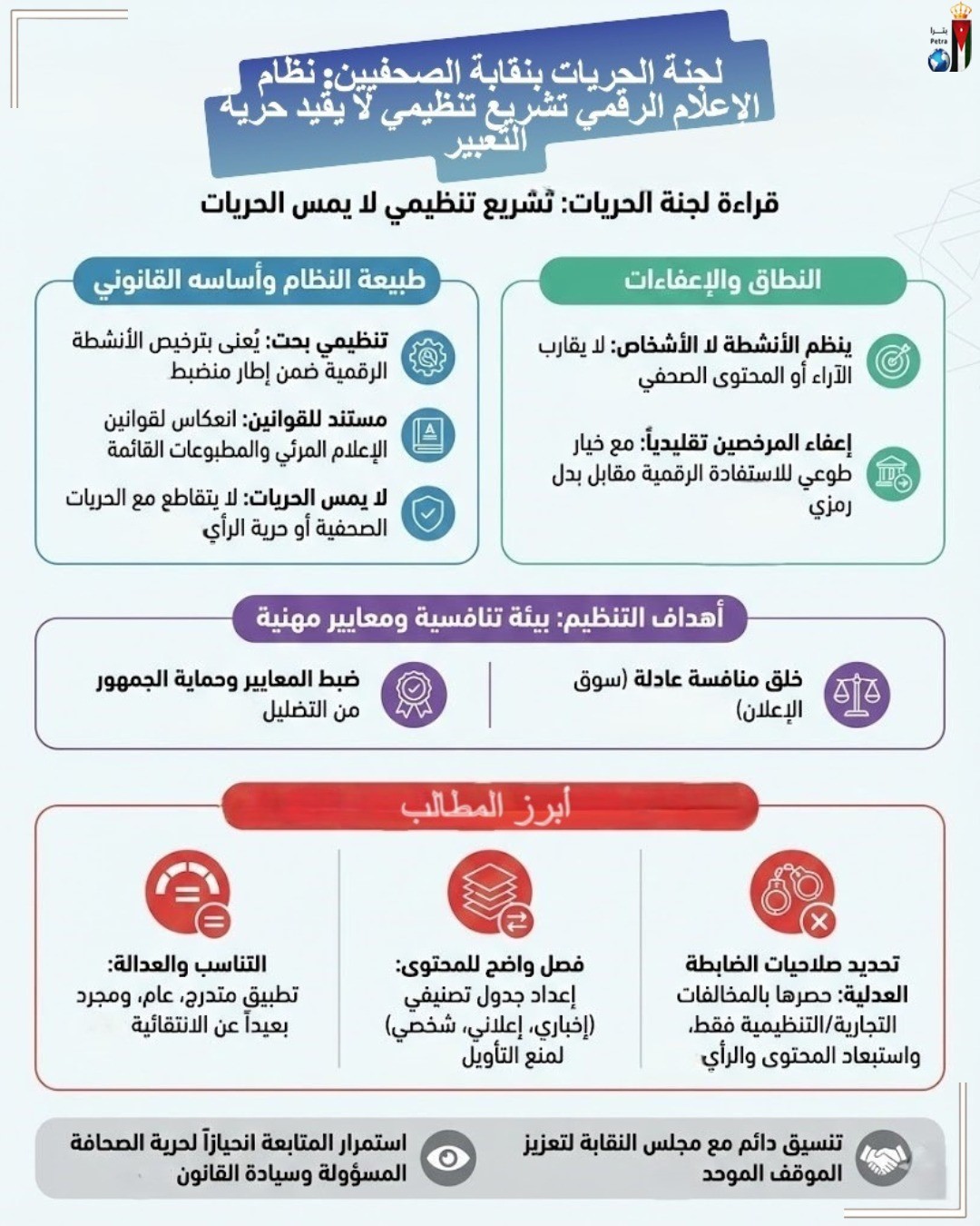 عمان جو - تابعت لجنة الحريات في نقابة الصحفيين الأردنيين، ما أثير من نقاشات حول مسودة نظام تنظيم الإعلام الرقمي لسنة 2026 وما رافقها من قراءات متباينة ومخاوف عبّرت عنها قطاعات إعلامية ومهنية مختلفة.