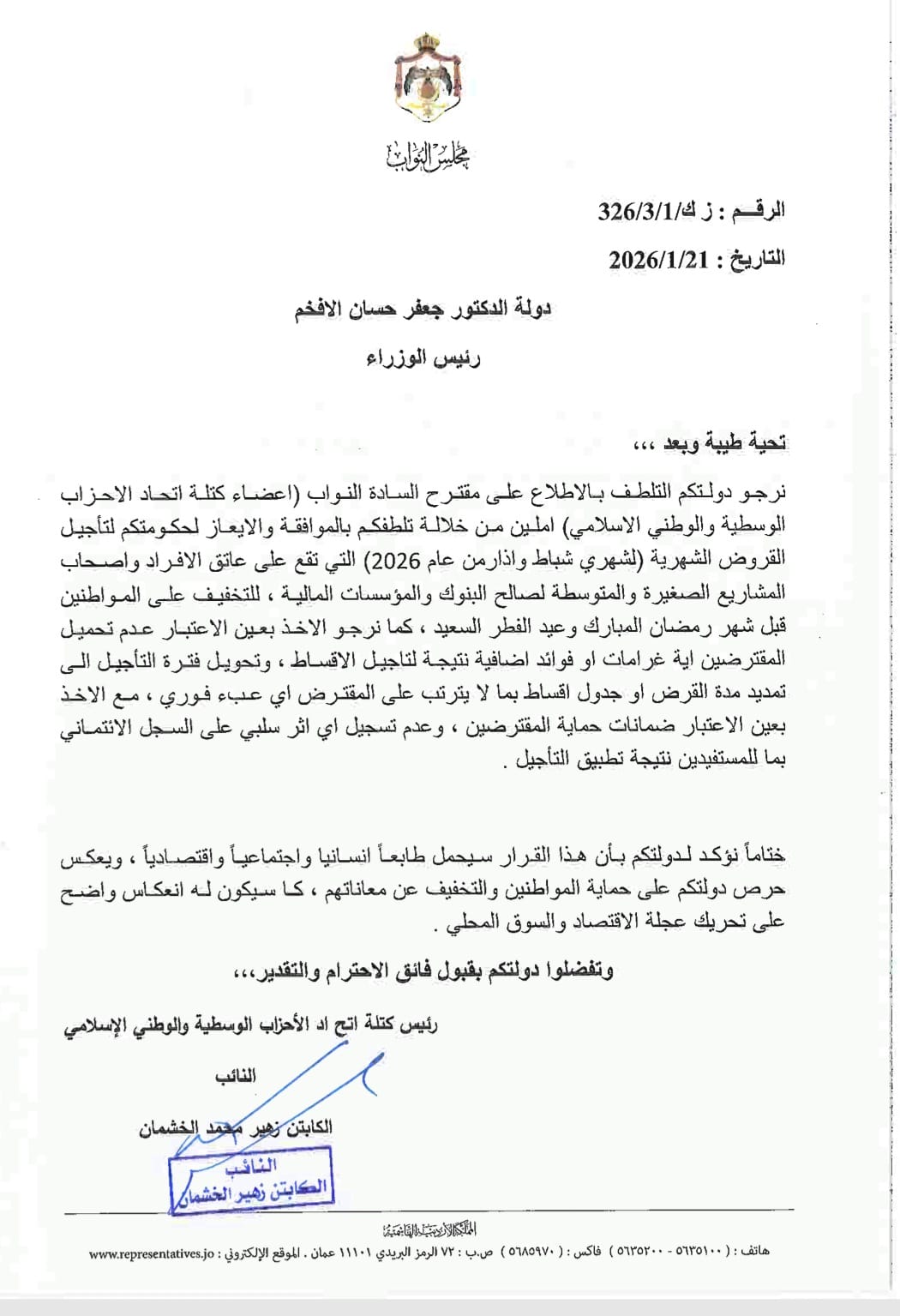 عمان جو - وجّه رئيس كتلة اتحاد الأحزاب الوسطية والوطني الإسلامي النيابية، النائب زهير الخشمان، مذكرة نيابية إلى دولة رئيس الوزراء الدكتور جعفر حسان، طالب فيها الحكومة بتأجيل الأقساط الشهرية المترتبة على الأفراد وأصحاب المشاريع الصغيرة والمتوسطة لصالح البنوك والمؤسسات المالية، خلال شهري شباط وآذار من عام 2026.