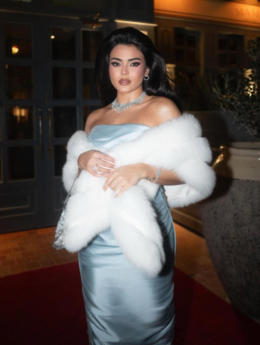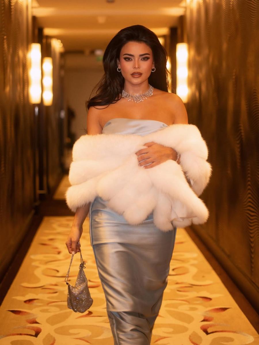 جمعت أسماء بإطلالتها في الحفل بين أناقة الفرو الأبيض على كتفيها ونعومة الساتان الأزرق بفستان سترابليس من تصميم #مرمر_حليم، والفخامة بمجوهرات ماسية مميزة من #شوبارد.