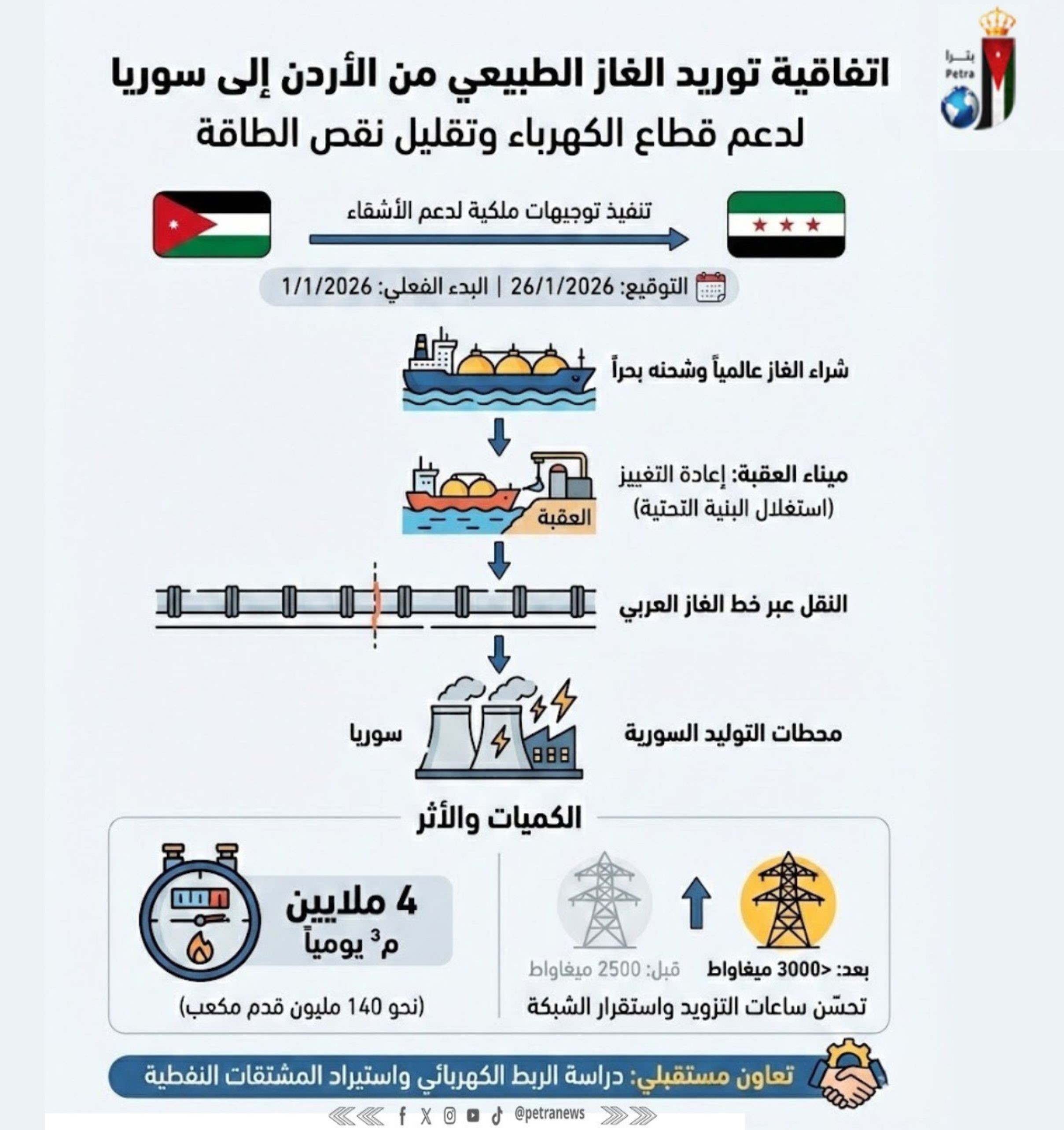 وبين في تصريحات صحفية عقب توقيع الاتفاقية، أن الاتفاقية تهدف الى تزويد سوريا بجزء من احتياجاتها من الغاز عن طريق استغلال البنية التحتية الموجودة بالمملكة عن طريق سفينة "التغييز" العائمة في العقبة وخط الغاز العربي، لافتا إلى أن تزويد سوريا بالغاز بدأ فعليا بداية العام الحالي 2026.