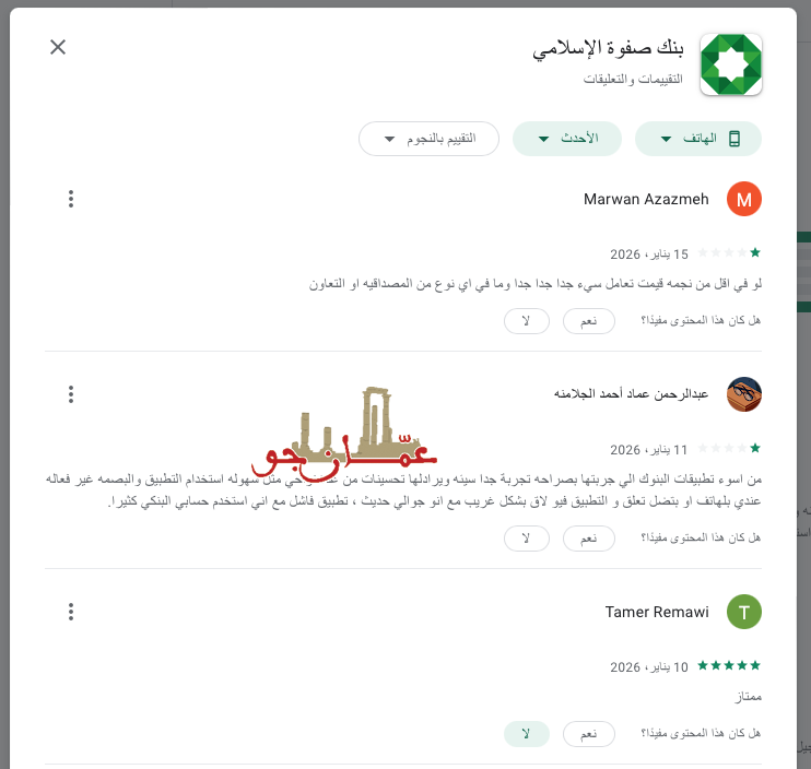 يثير تراجع تقييم تطبيق بنك صفوة الإسلامي على متجري جوجل بلاي وآبل ستور وتزايد تعليقات المستخدمين التي تتحدث عن مشكلات فنية وصعوبات في الاستخدام تساؤلات لدى عدد من المواطنين والعملاء حول مدى متابعة الإدارة العليا في البنك وعلى رأسها الرئيس التنفيذي سامر التميمي لهذه الملاحظات وما إذا كانت تصل إلى دوائر اتخاذ القرار داخل البنك.