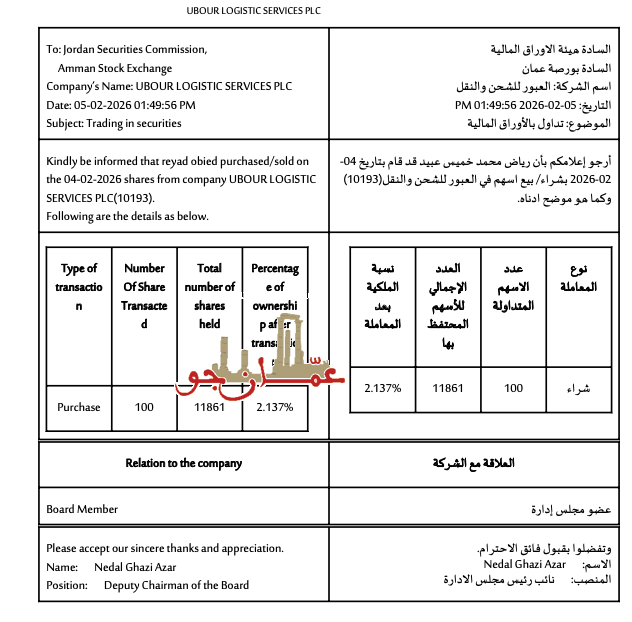 ووافقت الهيئة العامة على إبراء ذمة أعضاء مجلس الإدارة عن تصرفاتهم خلال السنة المالية المنتهية في 31 كانون الأول 2024 كما جرى انتخاب مجلس إدارة جديد ضم ميسون شاكر شكري أبو عوض وأنور محمد أحمد عيسى ومحمد حمزه فتح الله الددو ومحمد عاطف محمد عيسى وعوني باير عيد سليمان وجميعهم من الجنسية الأردنية.
