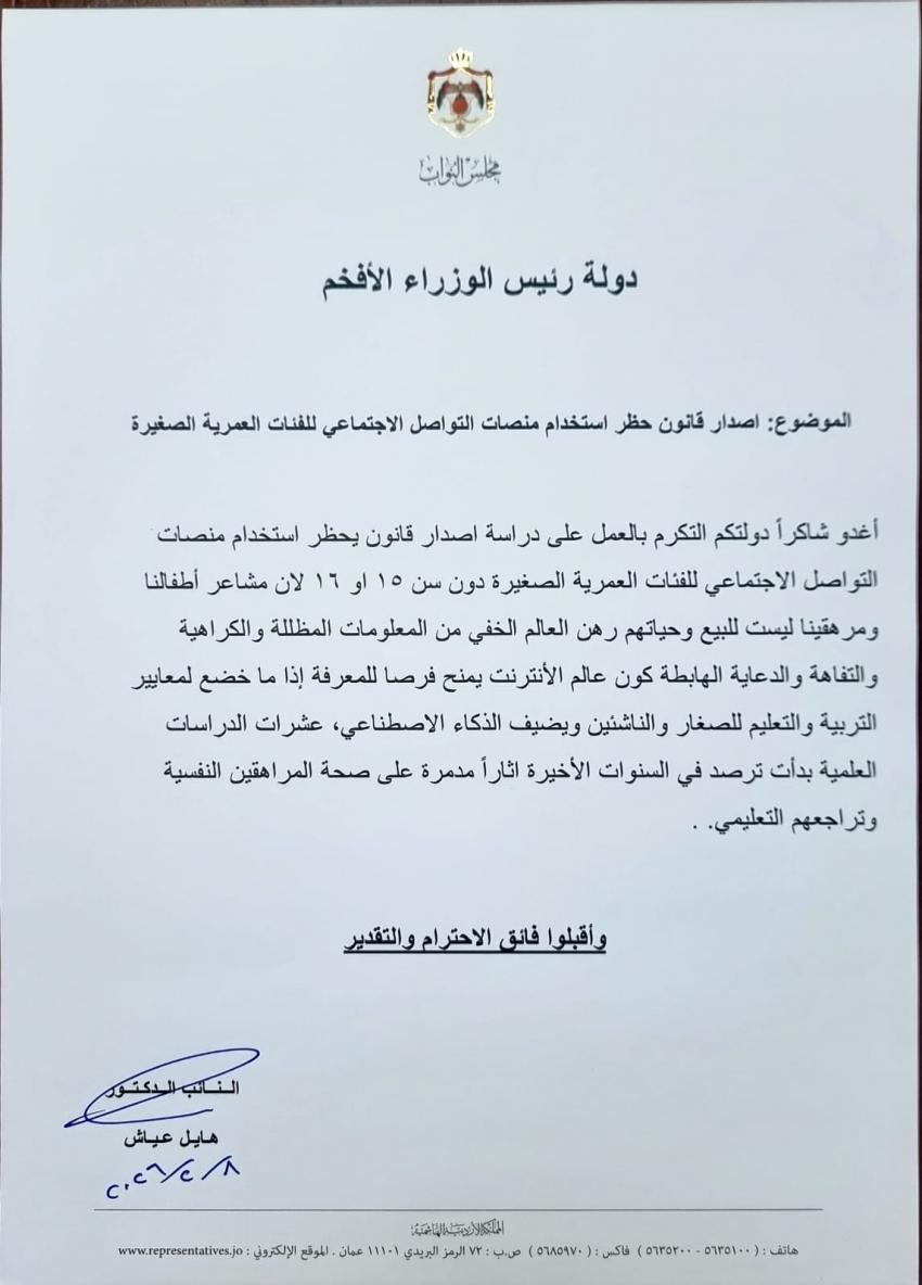 وكان تقدم النائب الاول لرئيس مجلس النواب النائب الدكتور خميس عطية بمقترح إلى رئيس الوزراء الدكتور جعفر حسان حول تنظيم استخدام مواقع التواصل الاجتماعي لمن هم دون 16.