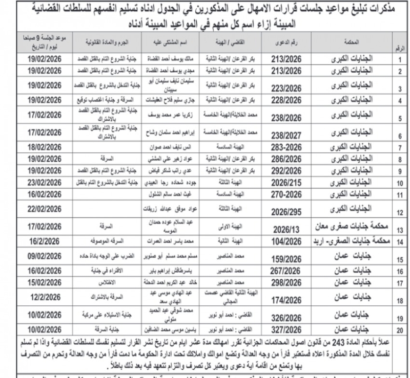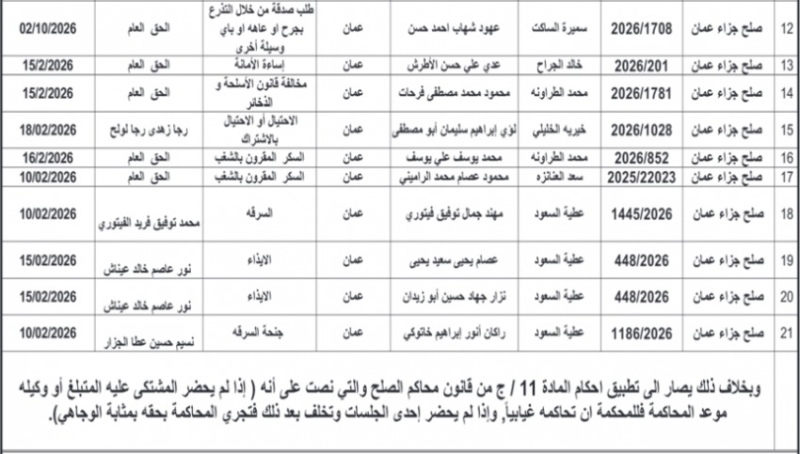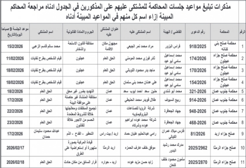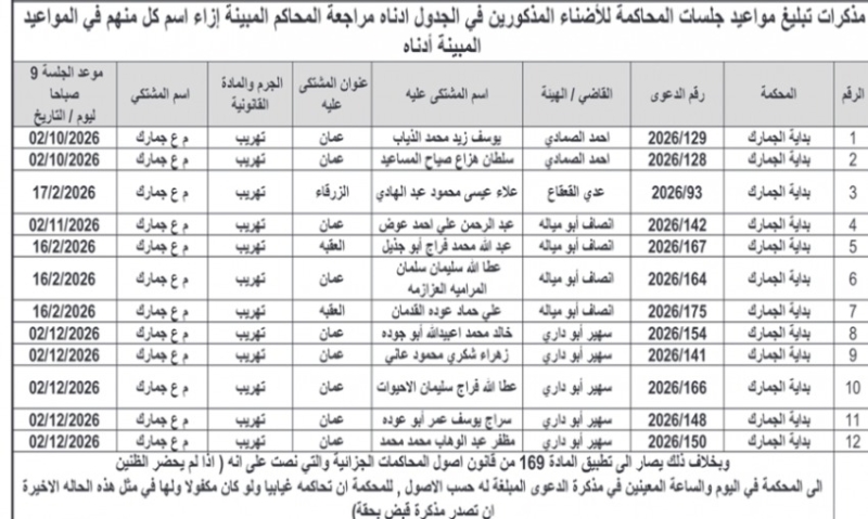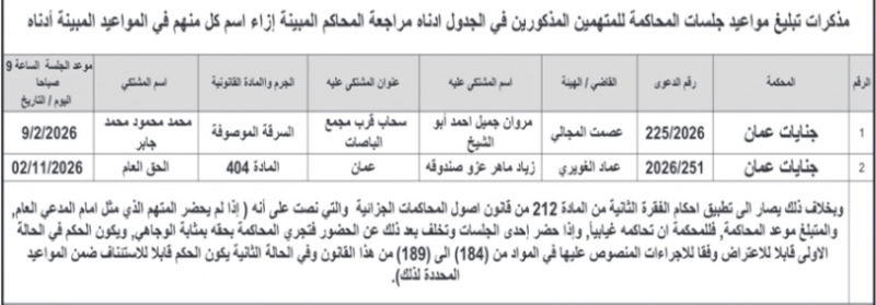 عمان جو - اصدرت اليوم الاثنين، مذكرات تبليغ بمواعيد جلسات المحاكمة لمشتكى عليهم في المحاكم النظامية.