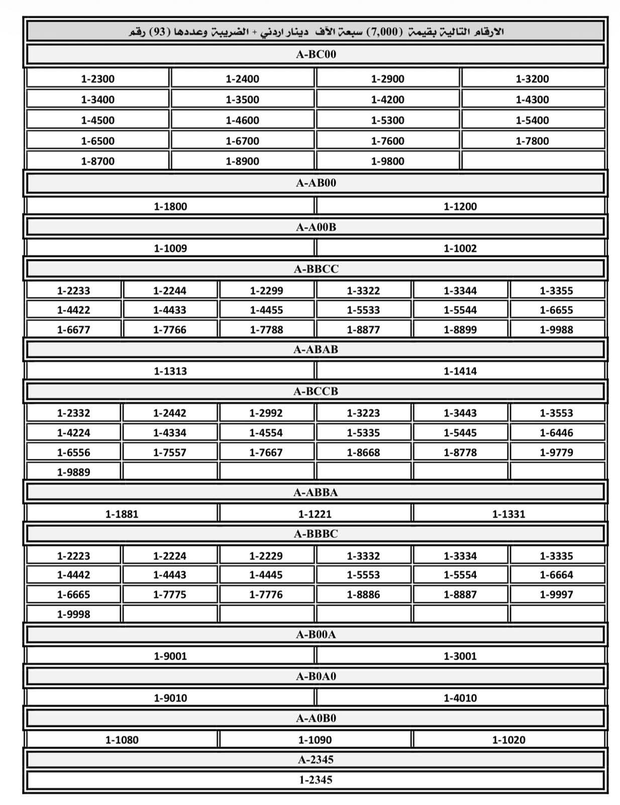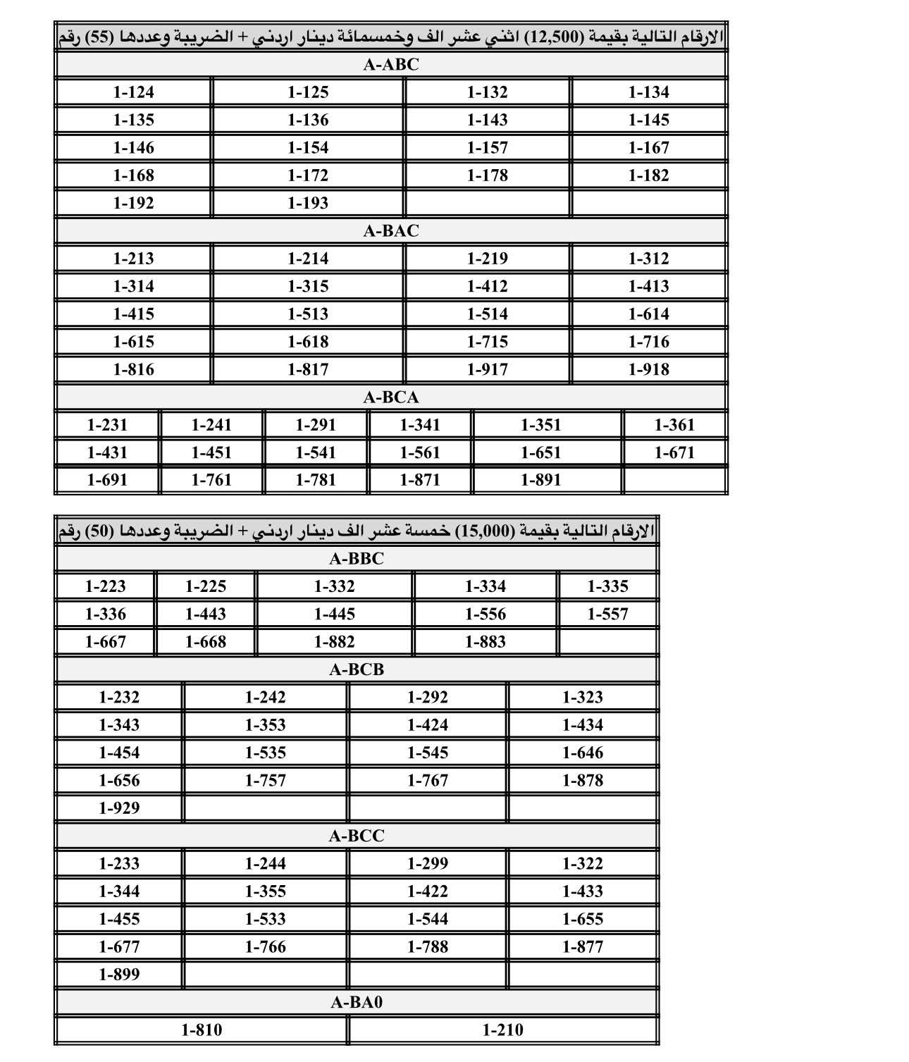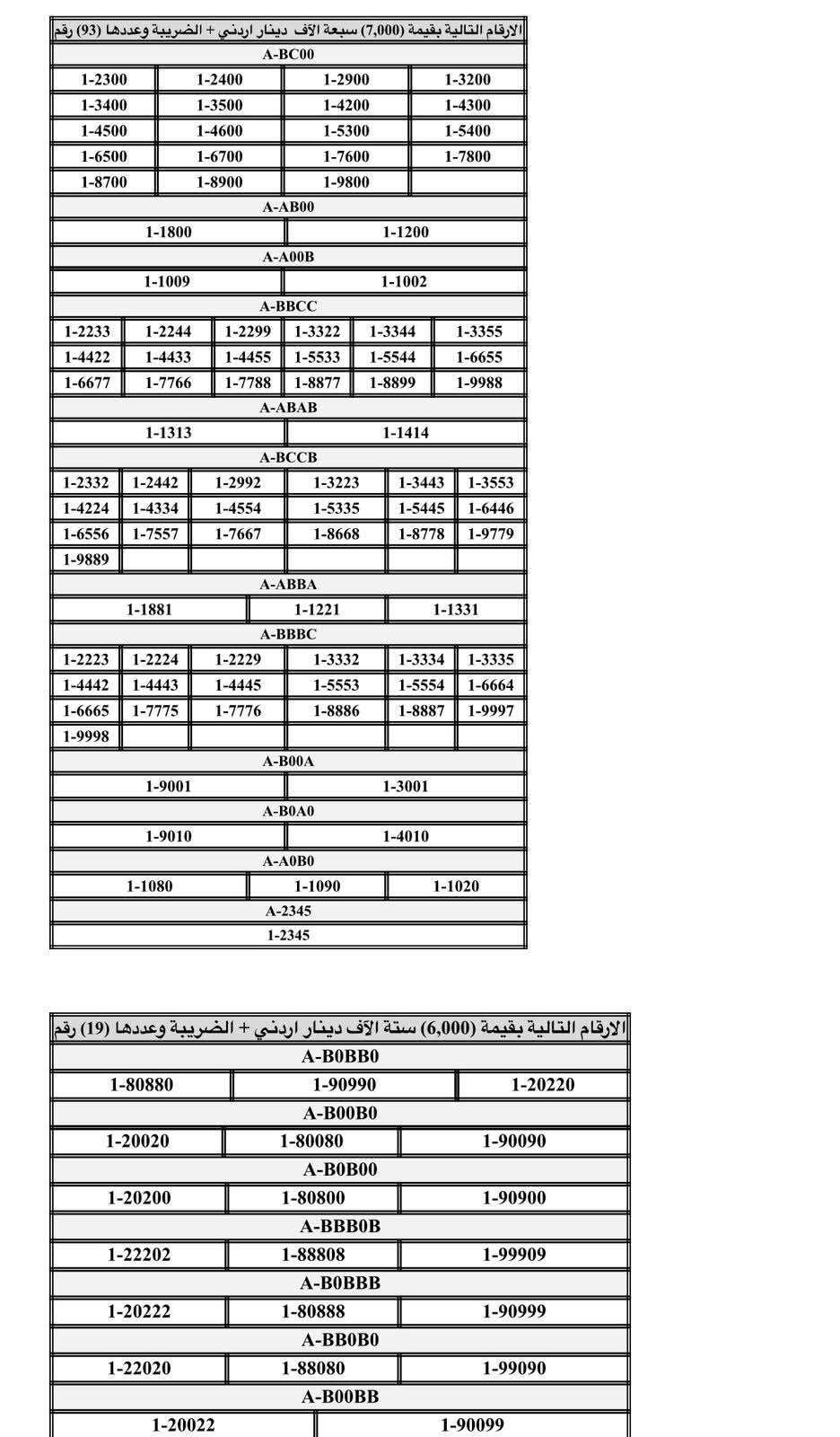 عمان جو - اعلنت إدارة ترخيص السواقين والمركبات عن طرح مجموعة من الأرقام الثلاثية والرباعية والخماسية من ترميز (1) للبيع المباشر من خلال البوابة الإلكترونية (والمبينة بالكشف المرفق).