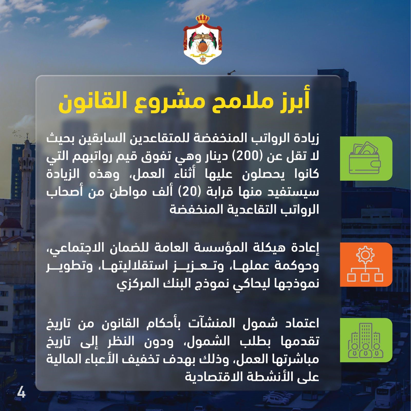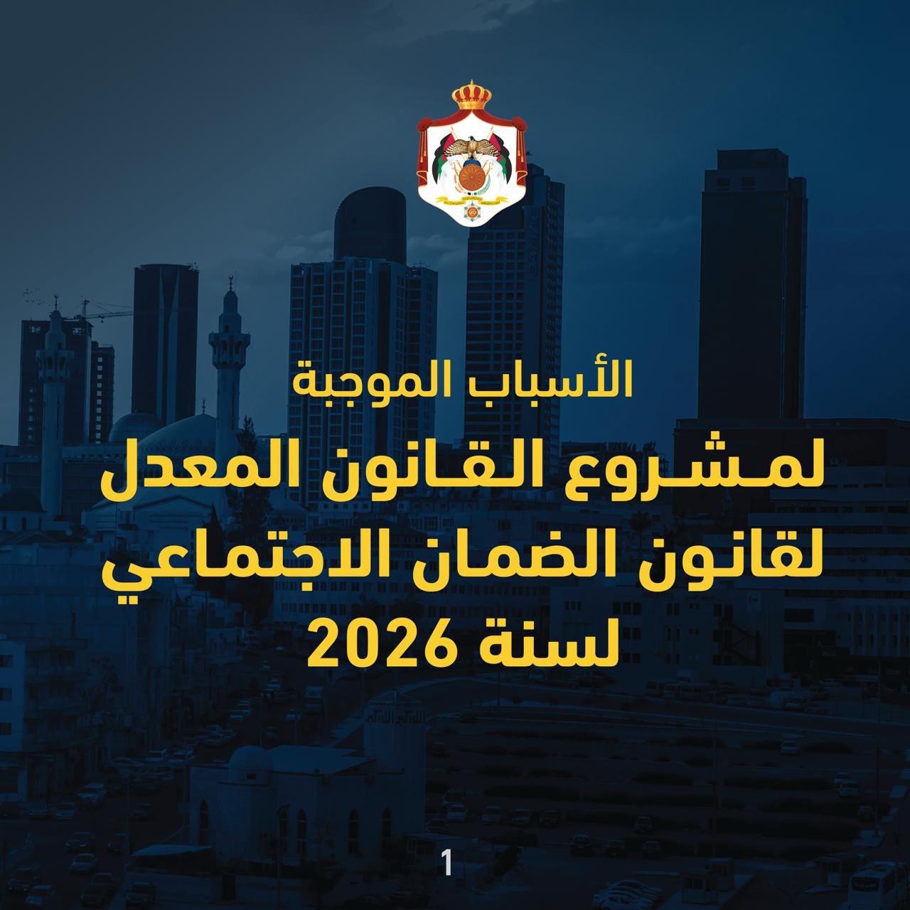 قرَّر مجلس الوزراء في جلسته التي عقدها اليوم الثُّلاثاء، برئاسة رئيس الوزراء الدكتور جعفر حسَّان، الموافقة على الأسباب الموجبة لمشروع قانون معدِّل لقانون الضَّمان الاجتماعي لسنة 2026م.