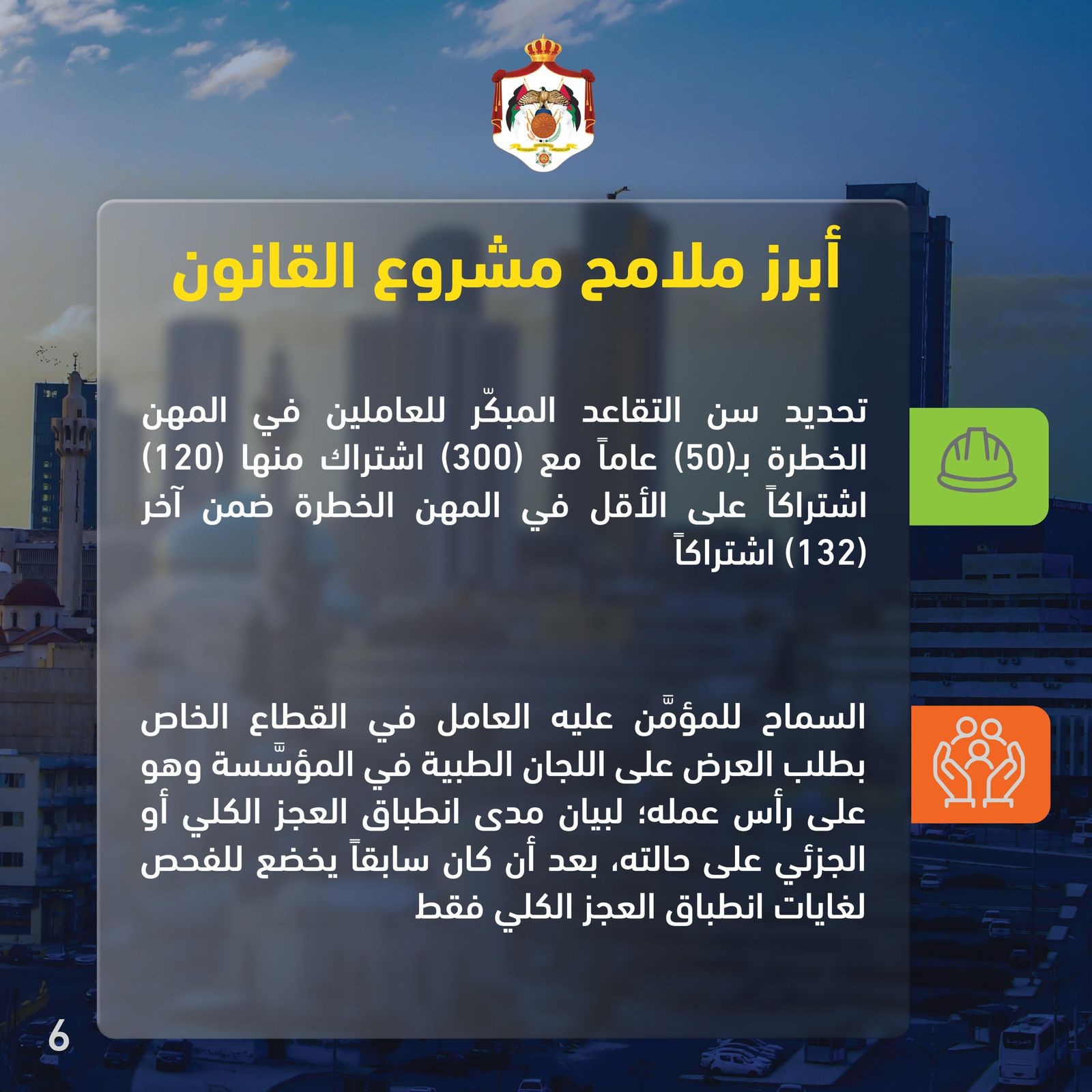 مشروع القانون المعدِّل يضمن للعاملين في المهن الخطرة الذين استوفوا شروط السن وعدد الاشتراكات اللازمة للتقاعد قبل 1/1/2027 الحفاظ على حقوقهم في التقاعد متى رغبوا بذلك.