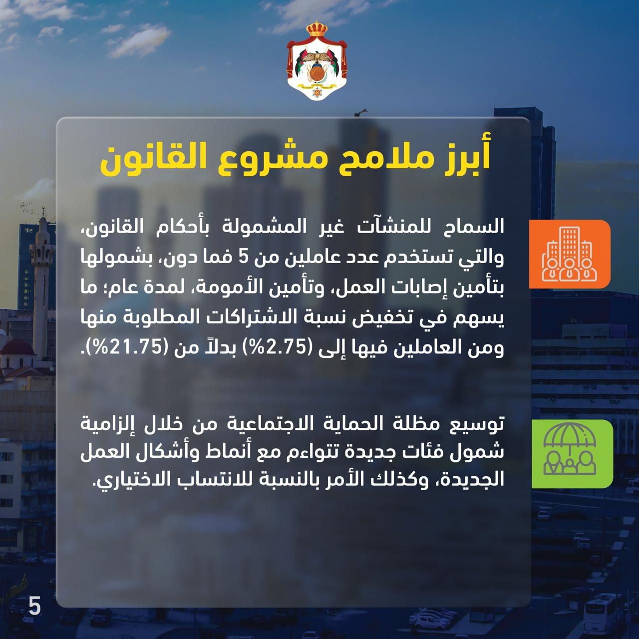 وتنصّ التَّعديلات على اعتماد شمول المنشآت بأحكام القانون من تاريخ تقدمها بطلب الشمول، ودون النظر إلى تاريخ مباشرتها العمل، وذلك بهدف تخفيف الأعباء المالية على الأنشطة الاقتصادية، كما سيتمّ السَّماح للمنشآت غير المشمولة بأحكام القانون، والتي تستخدم عدد عاملين من خمسة فما دون، بشمولها بتأمين إصابات العمل وتأمين الأمومة لمدة عام؛ ما يسهم في تخفيض الاشتراكات المطلوبة منها ومن العاملين فيها إلى 2.75% بدلاً من 21.75%.