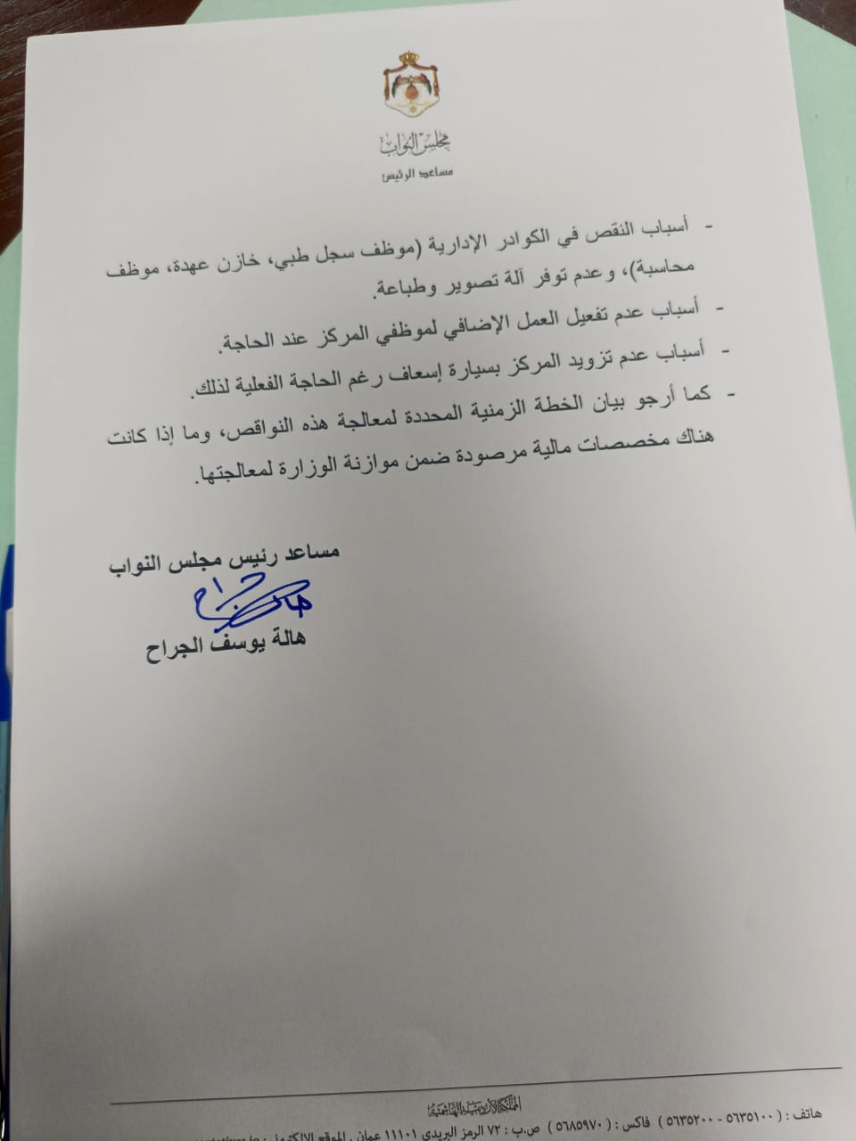 وطالبت الجراح الوزارة بجدول زمني محدد لمعالجة هذه النواقص، وتساءلت عن المخصصات المالية المرصودة ضمن الموازنة لإنقاذ الوضع الصحي في المنطقة.