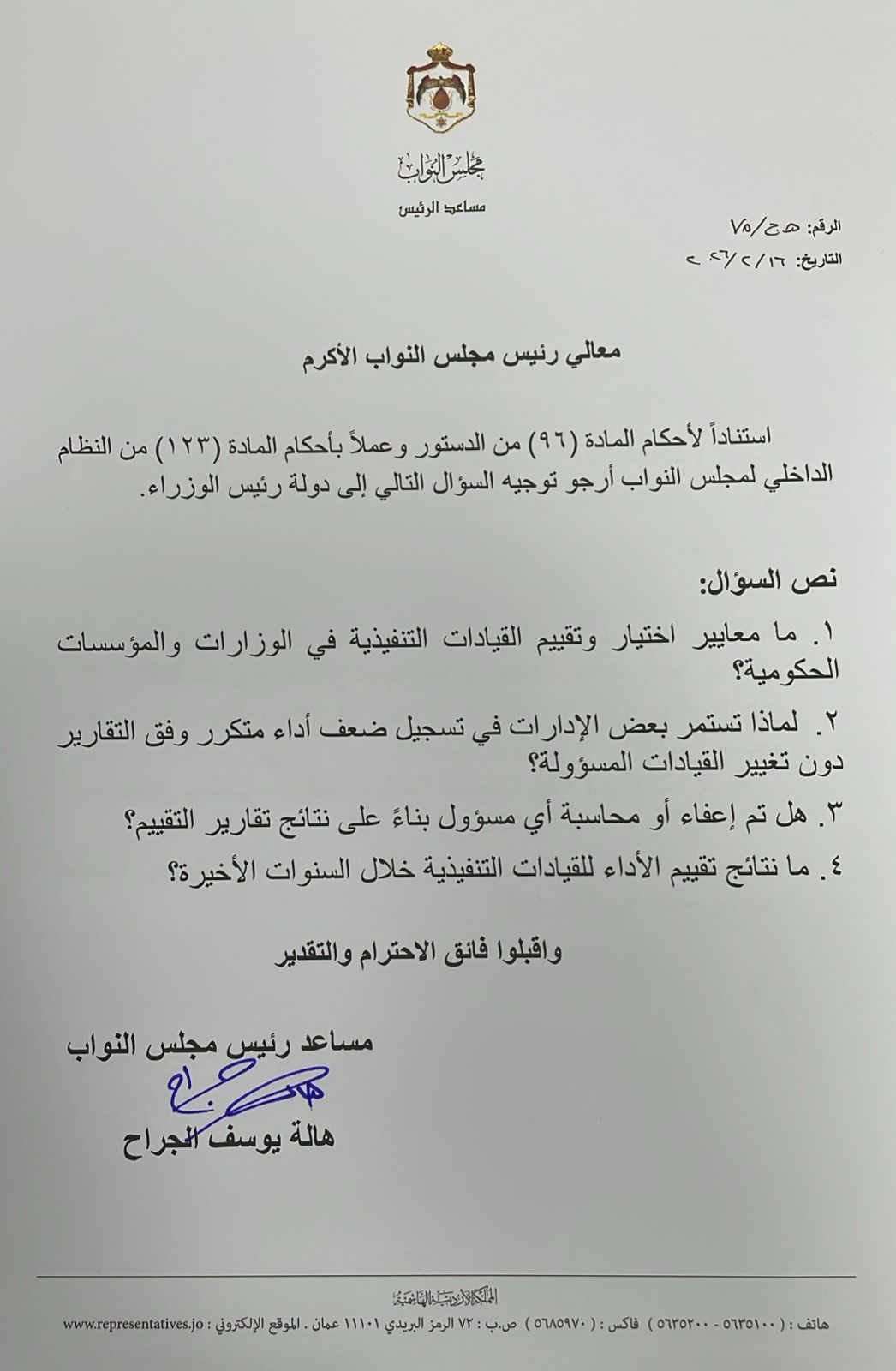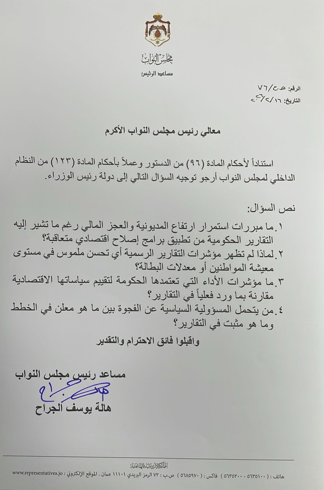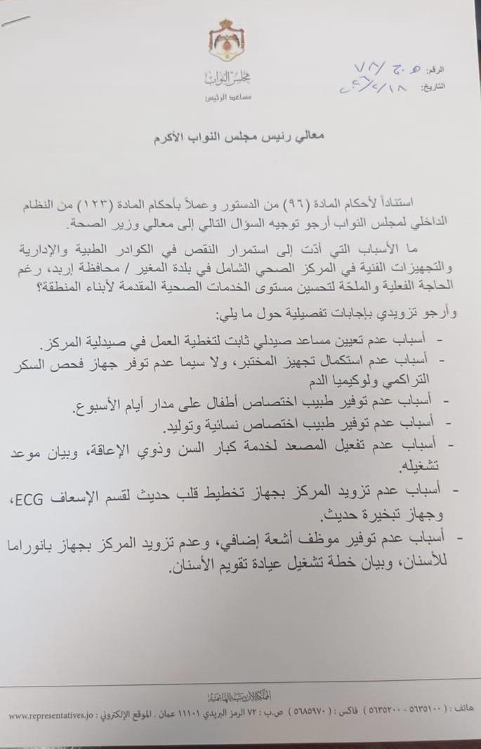 وتأتي هذه الحزمة من الأسئلة بشكل لا تستهدف الاستيضاح فقط، بل تضع الحكومة أمام مسؤولياتها القانونية والدستورية في ملفات تمس الأمن المعيشي والصحي للمواطن الأردني.