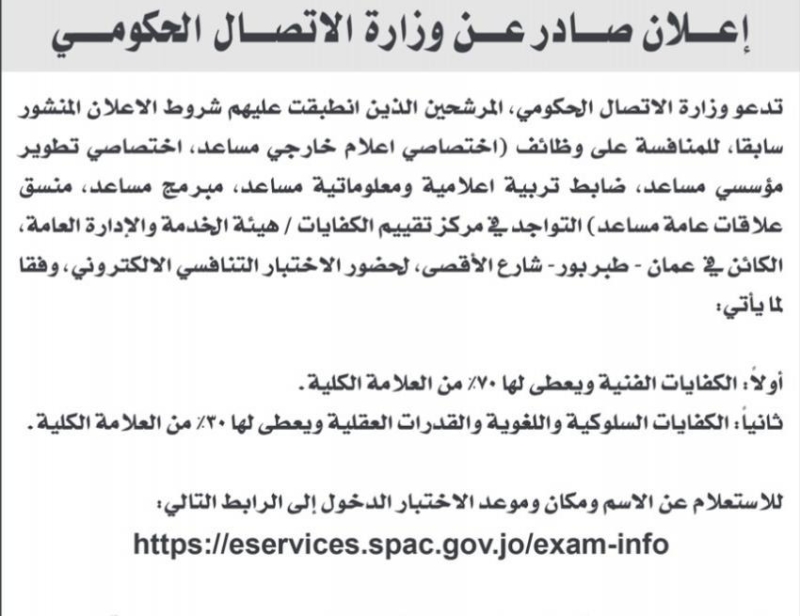 كما دعت دوائر حكومية المرشحين الذين انطبقت عليهم شروط الاعلان المنشور سابقا للامتحان التنافسي.
