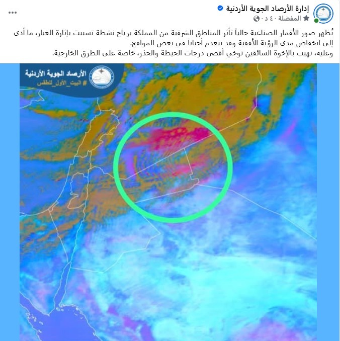 وأوضحت الدائرة، استناداً إلى صور الأقمار الصناعية، أن الكتلة الهوائية المثيرة للغبار ما تزال تؤثر على بعض المناطق في المملكة ، الأمر الذي يستدعي الانتباه إلى احتمالية تدني الرؤية بشكل مفاجئ على الطرق الخارجية