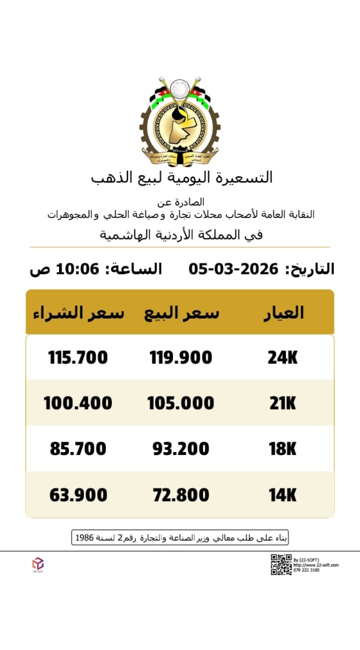 عمان جو - استقرت أسعار الذهب في السوق المحلية الأردنية، اليوم الخميس 5 مارس 2026، وفق التسعيرة الصادرة عن النقابة العامة لأصحاب محلات تجارة وصياغة الحلي والمجوهرات.