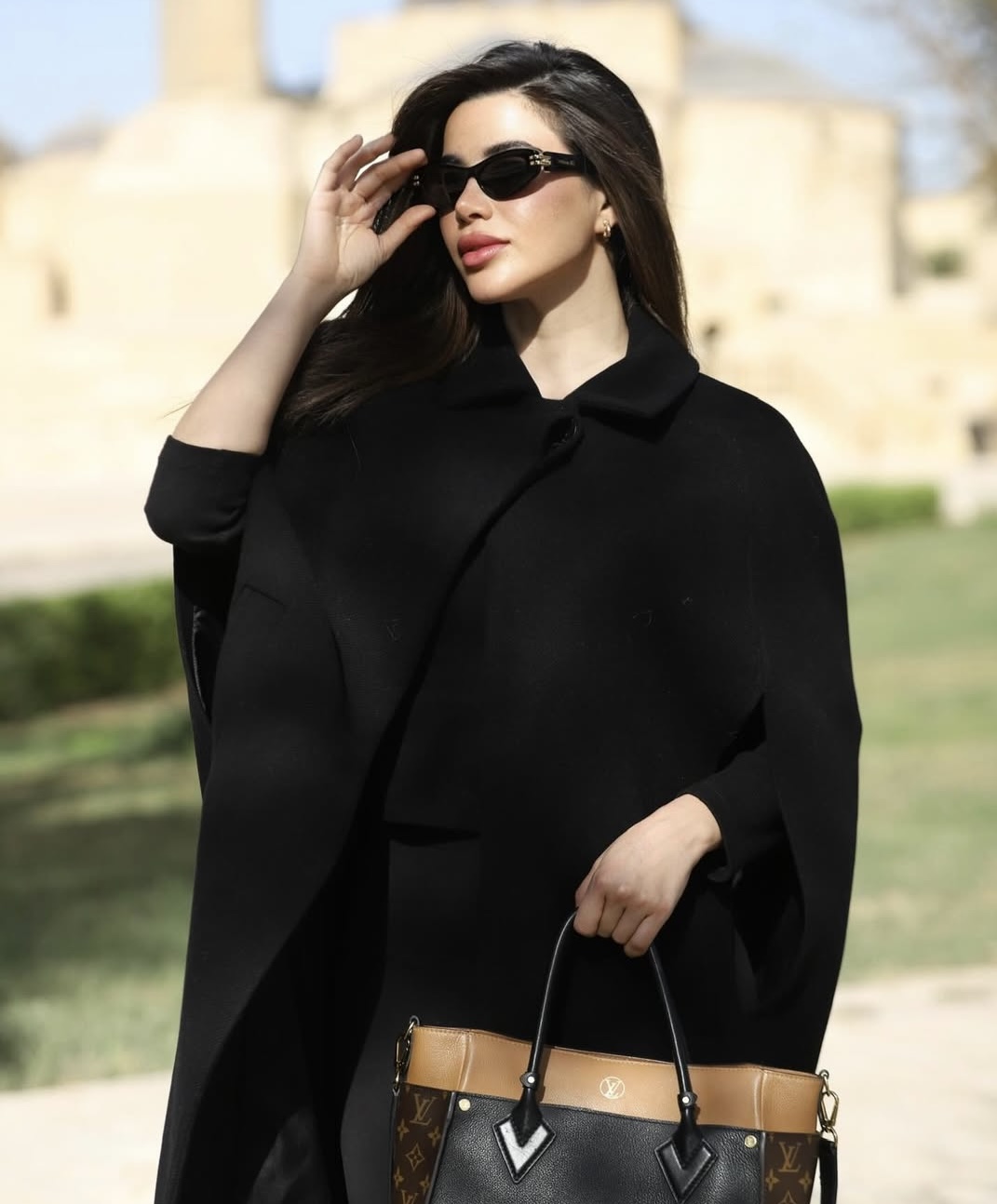 لفتت يارا السكري الأنظار بهذه الإطلالة الأنيقة والراقية في نفس الوقت، والتي تليق بأجواء شهر رمضان في العزومات؛ حيث اعتمدت توب وتنورة باللون الأسود مع معطف بصيحة الكاب باللون الأسود بياقة مع زر أمامي يزيّنه؛ ليضيف لمسة جذابة للتصميم. ونسّقت معه حقيبة تجمع بين الأسود ودرجات البُني من لويس فويتون Louis Vuitton، ونظارة شمسية سوداء.