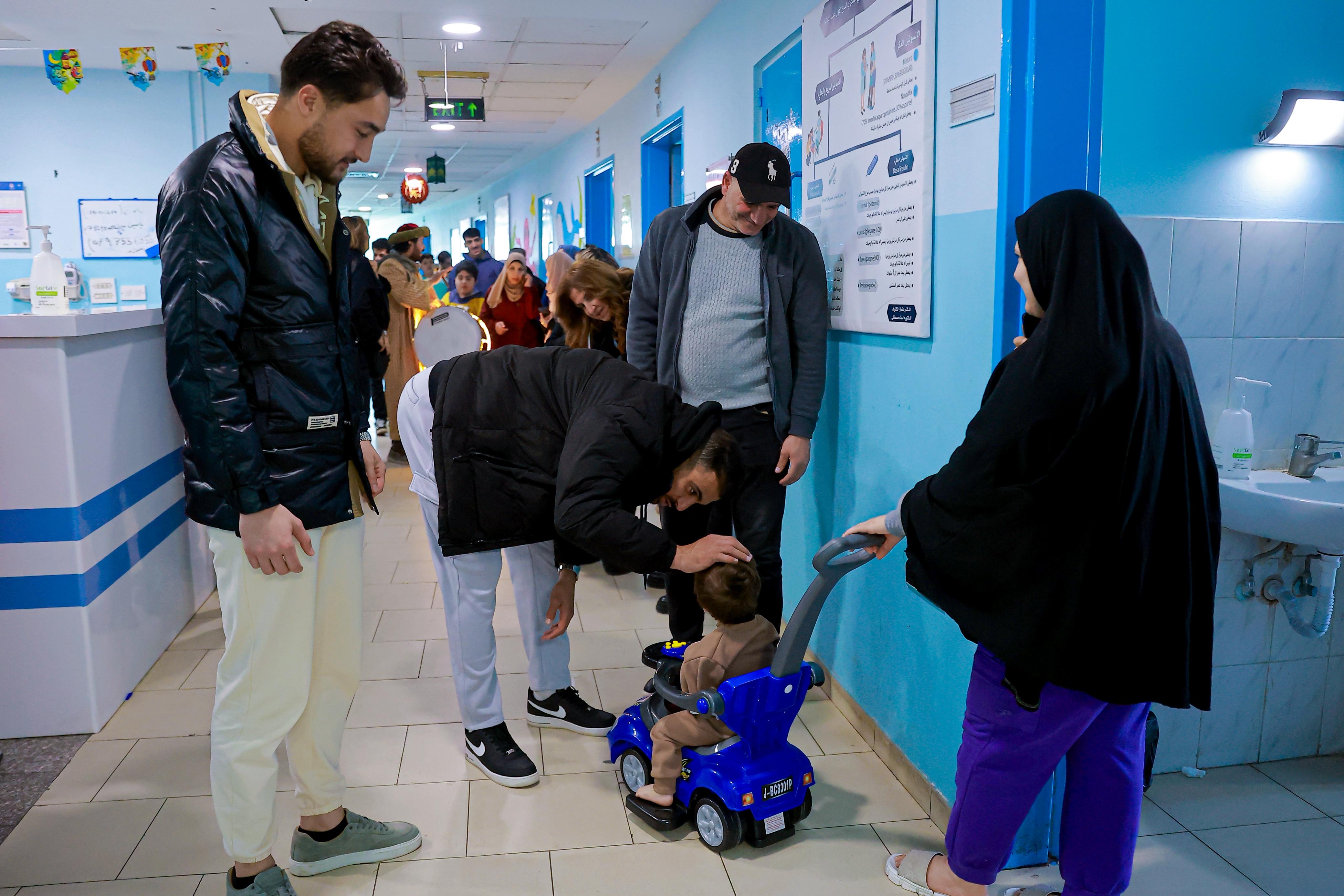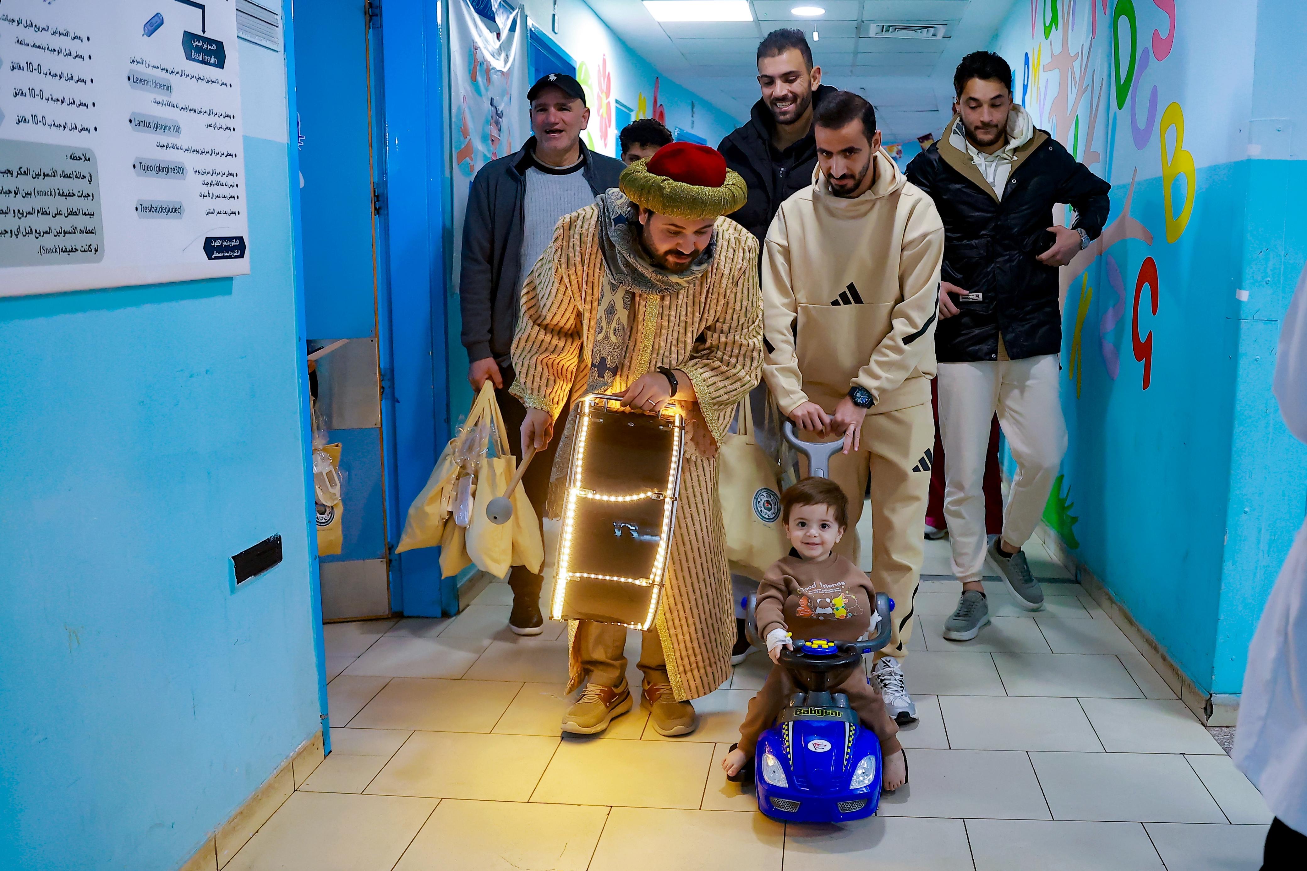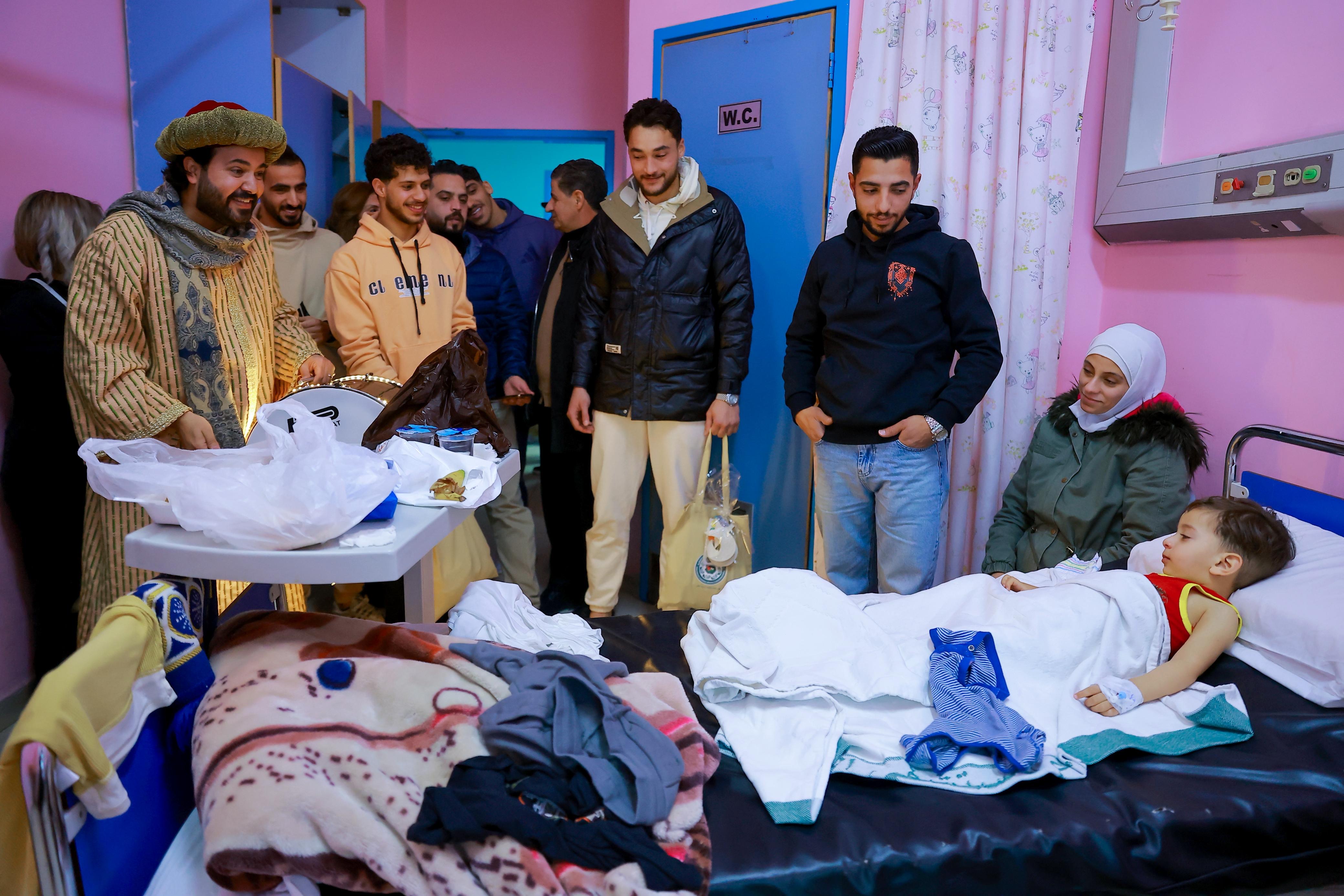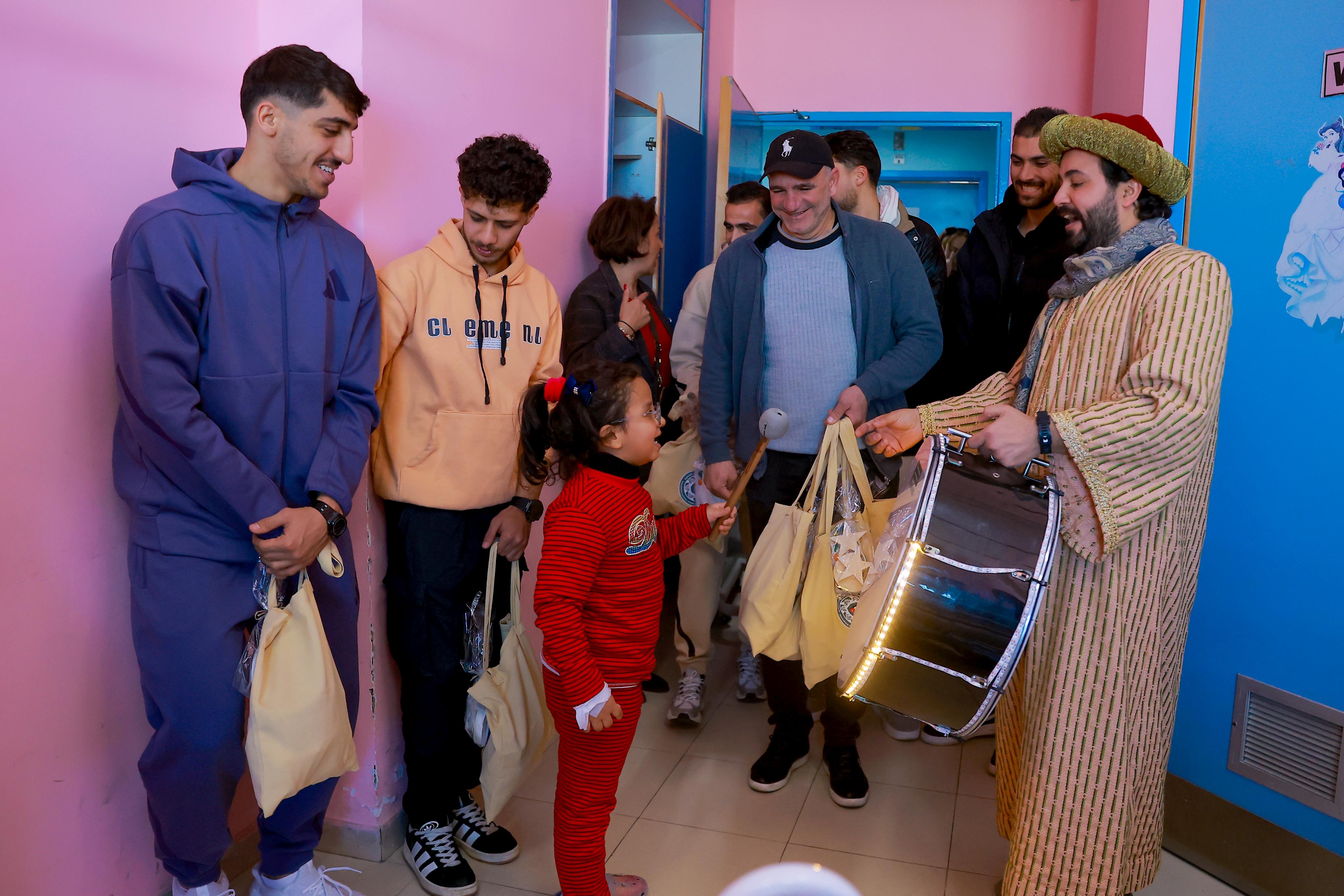 مؤيد سليم، ديانا الدلو، لبنى كرادشة وروجينا سليمان و عثمان الحسنات بالتجول داخل القسم وزيارة غرف المرضى والحديث معهم والتقاط الصور التذكارية مع الأطفال الذين كانوا في غاية السعادة.