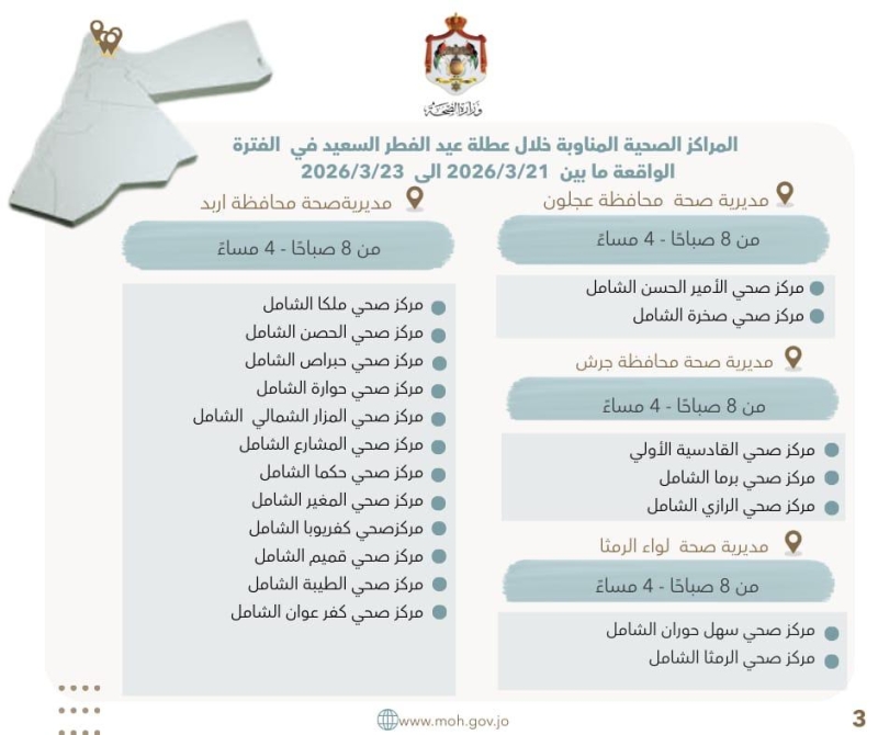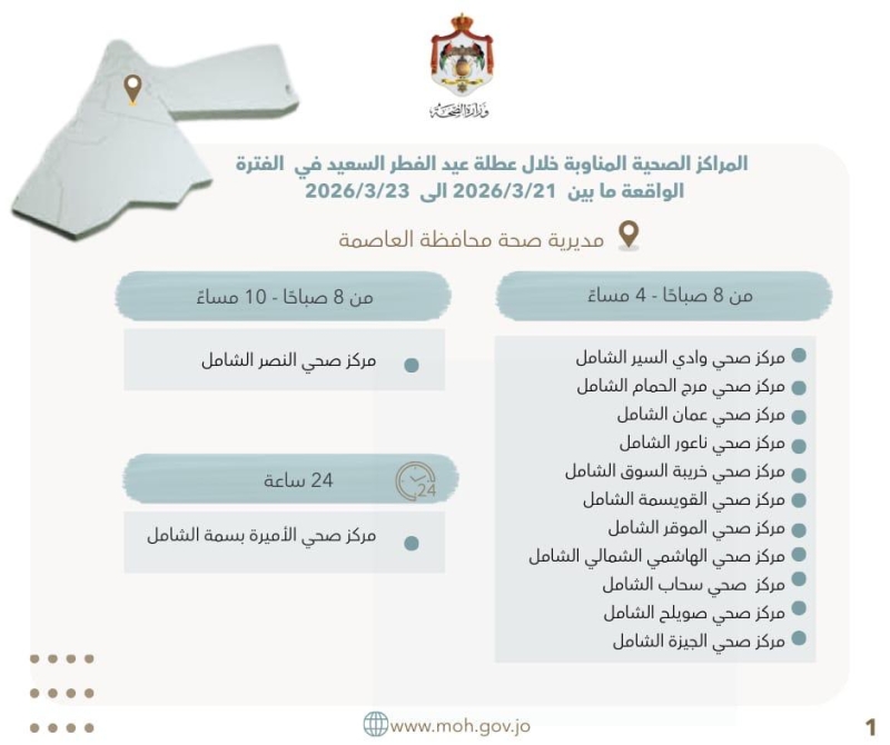 عمان جو - أُعلنت أسماء المراكز الصحية المناوبة خلال عطلة عيد الفطر السعيد، في الفترة الواقعة ما بين 21 و23 آذار/مارس 2026، في جميع محافظات المملكة، والبالغ عددها 106 مراكز صحية.