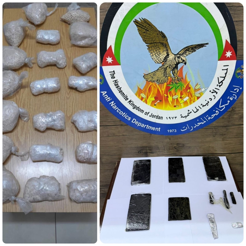 وفي محافظة البلقاء دوهم مروج للمواد المخدرة وأُلقي القبض عليه بعد أن أبدى مقاومة شديدة للقوة وأطلق النار باتجاهها، وتم ضبطه والتعامل معه دون إصابات تُذكر وضُبط بحوزته السلاح الناري الذي استخدمه وكمّية من المواد المخدرة.