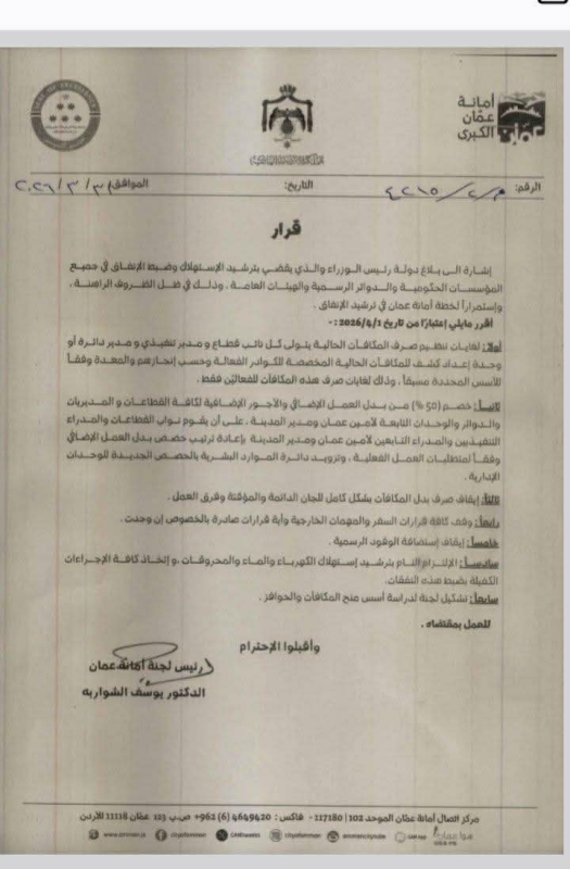 عمان جو - أقر رئيس لجنة أمانة عمان، الدكتور يوسف الشواربة، حزمة من القرارات والإجراءات التنظيمية الرامية إلى ضبط النفقات وترشيد الاستهلاك في مختلف قطاعات ومديريات الأمانة، شملت إعادة النظر في منظومة المكافآت والحوافز وبدل العمل الإضافي.