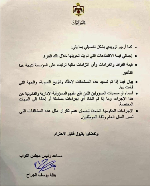 وتساءلت الجراح في كتابها الرسمي عن الأسباب التي دفعت المؤسسة لعدم تحويل هذه الاقتطاعات رغم حسمها من الرواتب، ومدى اعتراف الحكومة بأن هذا الإجراء يشكل مخالفة صريحة للتشريعات الضريبية النافذة.