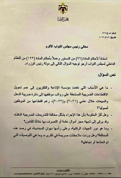 عمان جو - وجهت مساعد رئيس مجلس النواب، وعضو حزب الإصلاح النائب هالة الجراح، سؤالاً رقابياً ساخناً إلى رئيس الوزراء، طالبت فيه بتوضيحات حكومية جادة حول عدم تحويل مؤسسة الإذاعة والتلفزيون للاقتطاعات الضريبية المستحقة على رواتب موظفيها إلى دائرة ضريبة الدخل والمبيعات.