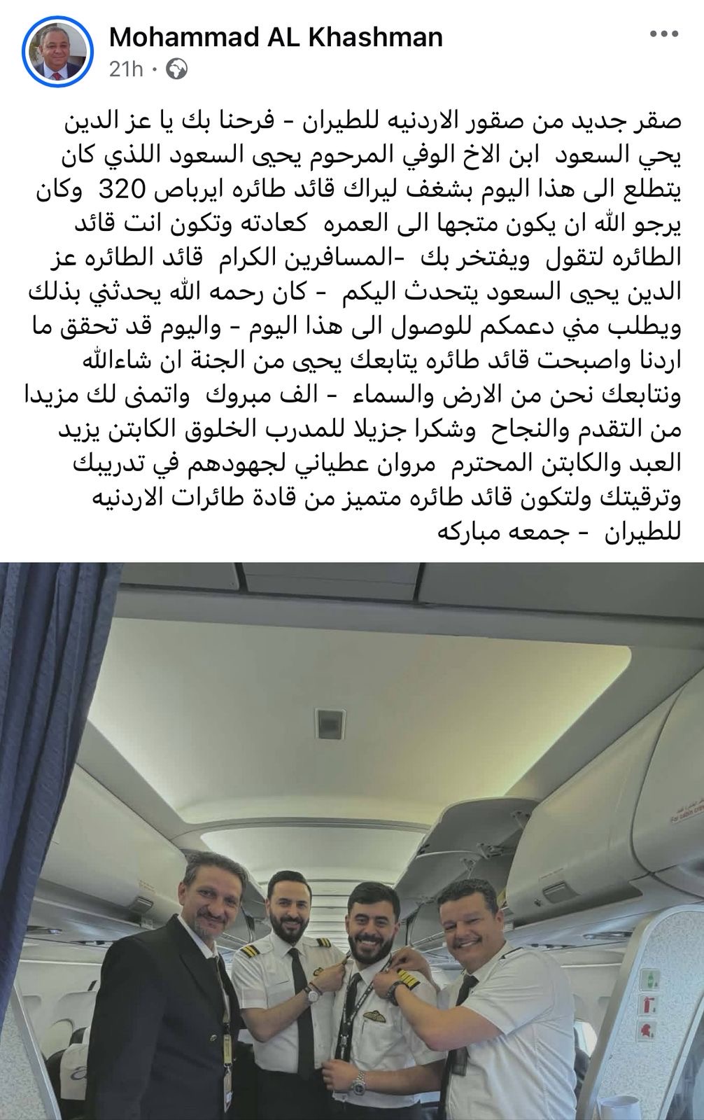 عمان جو - في لفتة مؤثرة تحمل الكثير من الفخر والوفاء أعلن الكابتن محمد الخشمان عبر صفحته على مواقع التواصل الاجتماعي عن ترقية الكابتن عز الدين يحيى السعود لقائداً لطائرة إيرباص 320 ليواصل بذلك تحقيق حلم والده الراحل يحيى السعود.