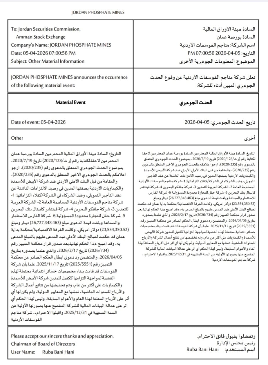 فالفوسفات في الوجدان الأردني ليس مجرد سلعة تُستخرج من باطن الأرض بل هي جزء من السردية الاقتصادية الوطنية قصة مورد شكّل في العقد الاخير رافعة للخزينة ورافدا للتنمية، وعنوانا لحضور الأردن في الأسواق العالمية وكل هذا تحقق بفعل ادارة استراتيجية كفؤة يقودها الذنيبات منذ توليه مسؤولية رئاسة مجلس ادارة الشركة في العقد الاخير والذي صنع فارقا في الانتاجية والتطوير وتنويع المنتج وتحقيق الارباح المجزية التي لم