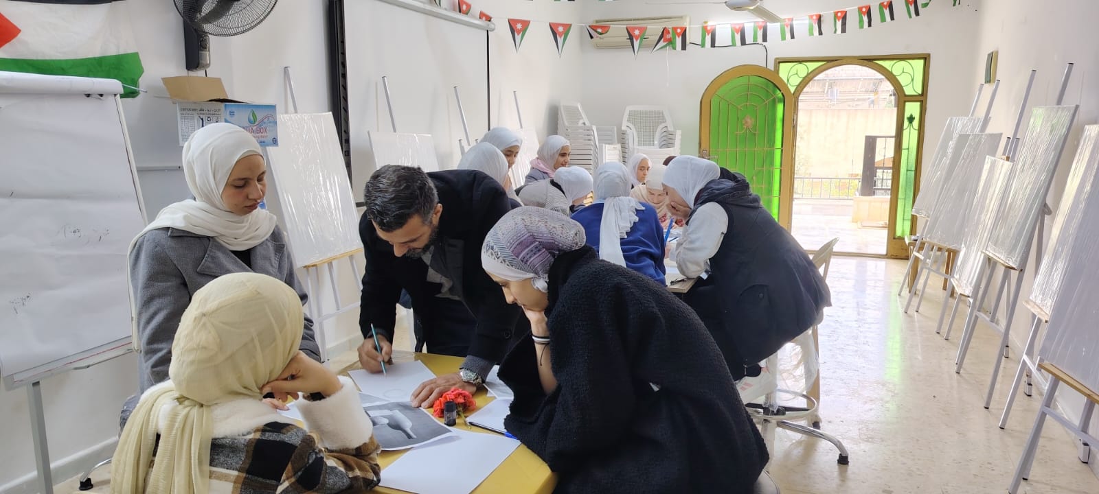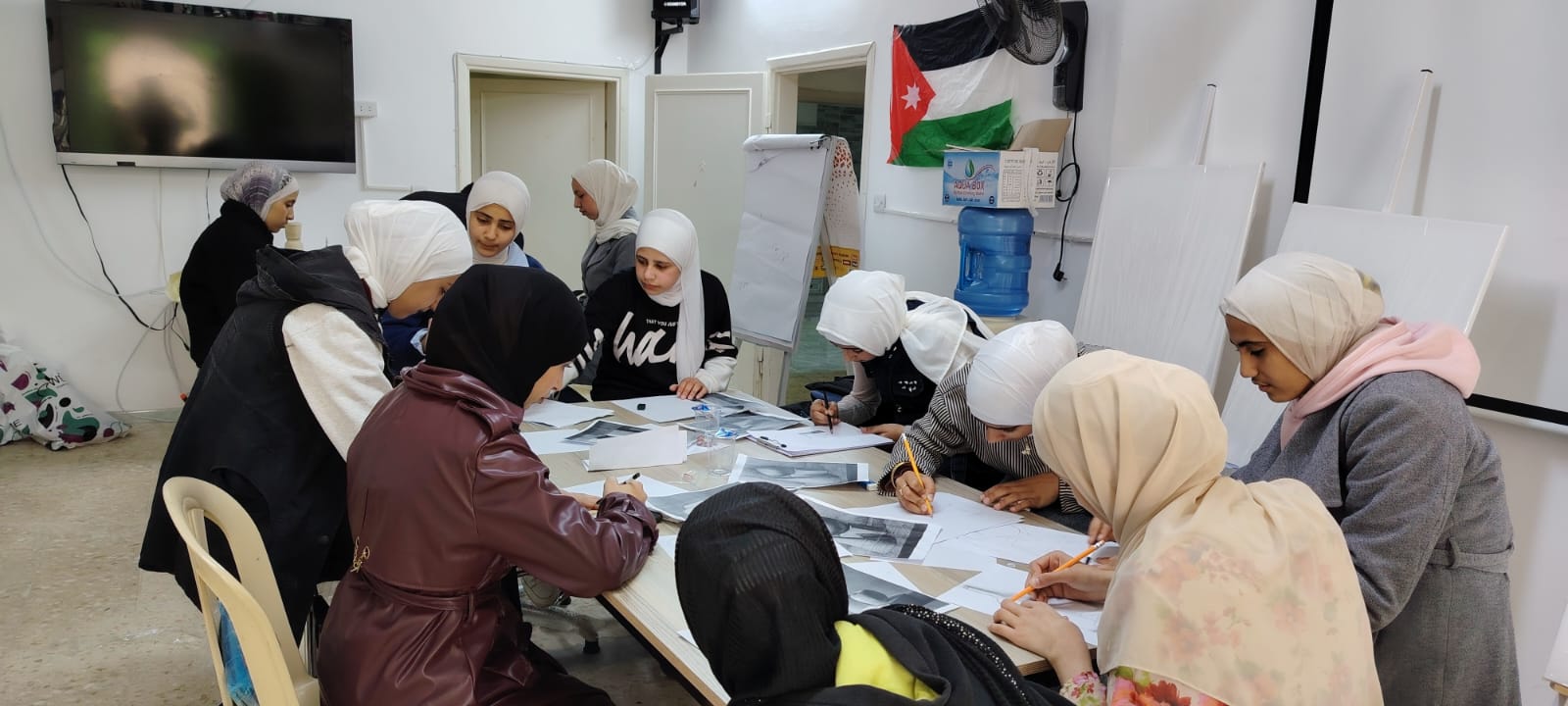 وفي سياق متصل، يهدف برنامج الرسم في مركز شابات جديتا، الذي يُنفذ بالتعاون مع مديرية ثقافة إربد، إلى تنمية المهارات الفنية والإبداعية لدى المشاركات، وتمكينهن من التعبير عن ذواتهن ضمن بيئة تعليمية محفزة. وتضمّنت جلسة اليوم شرحًا للأسس الأولية للرسم قدّمه المدرب يحيى مفرج، حيث ركّز على الطريقة الصحيحة لمسك القلم، والتدريب على رسم الكتلة وفهم الأشكال الأساسية، إضافة إلى تناول مفهوم النسب والتناسب وأهميته في تحقيق التوازن والدقة، إلى جانب التعرف على أساليب التظليل المختلفة لإضفاء العمق والواقعية على الرسومات.