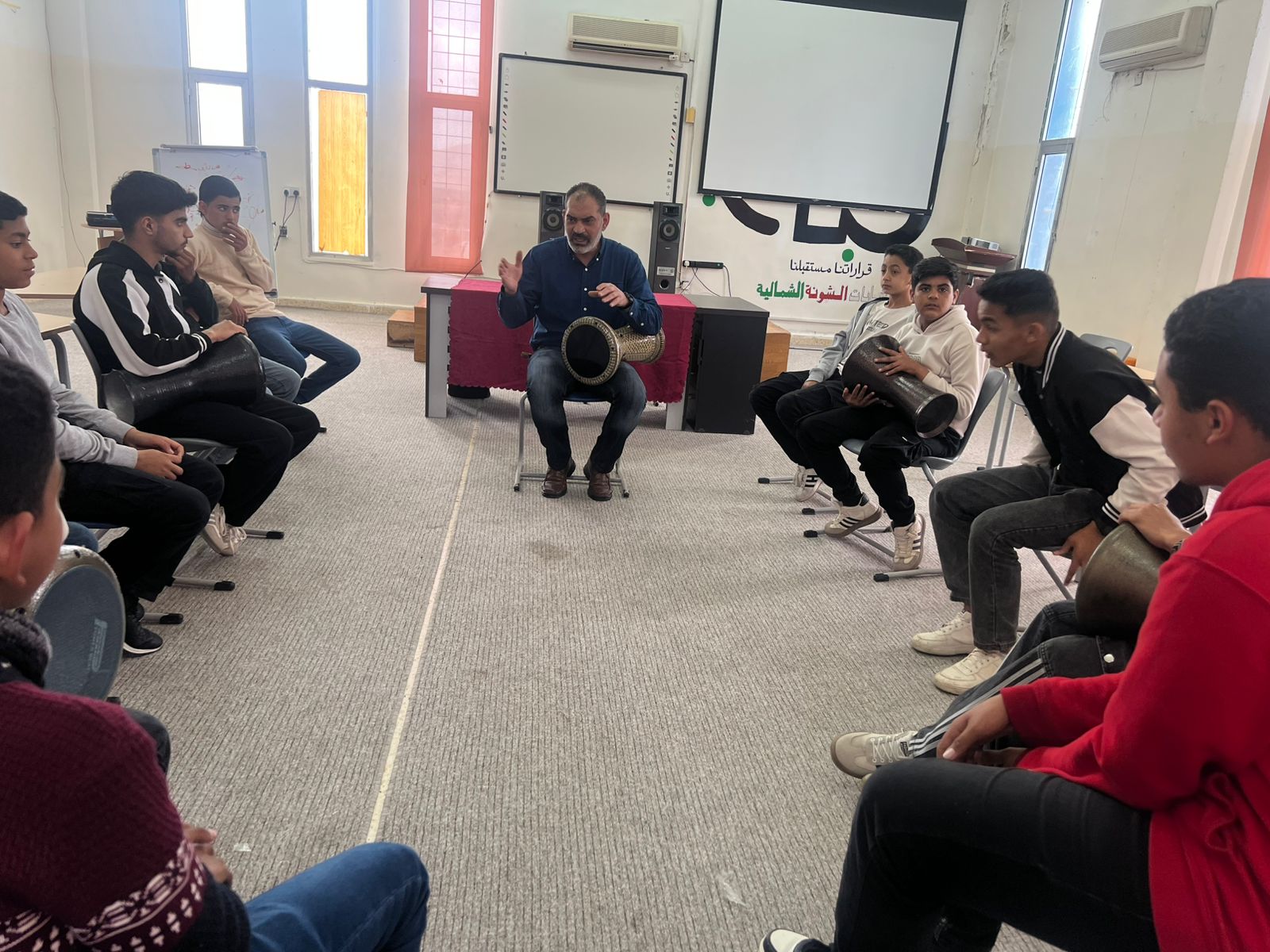 ويهدف برنامج العزف على الإيقاع إلى تعريف المشاركين بأساسيات العزف على الآلات الإيقاعية، وتنمية الحس الموسيقي لديهم، إضافة إلى تعزيز مهارات التركيز والانضباط والعمل الجماعي من خلال التدريب العملي. واستهل المدرب أحمد الدغيم البرنامج بشرح أساسيات أصوات الإيقاع، حيث تعرّف المشاركون على النغمات الرئيسية (دم – إس – تك)، وآلية إصدارها بشكل صحيح، إلى جانب توضيح وضعية اليدين وأساليب التحكم بالإيقاع. وشهدت الفعالية تفاعلًا ملحوظًا من المشاركين وسط أجواء حماسية حفّزتهم على التعلم واكتشاف مهاراتهم الموسيقية.