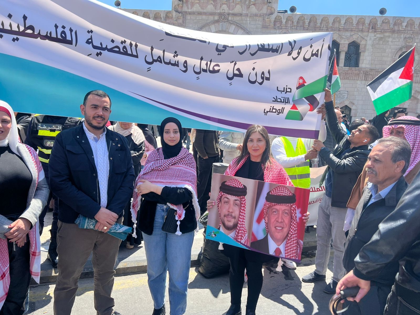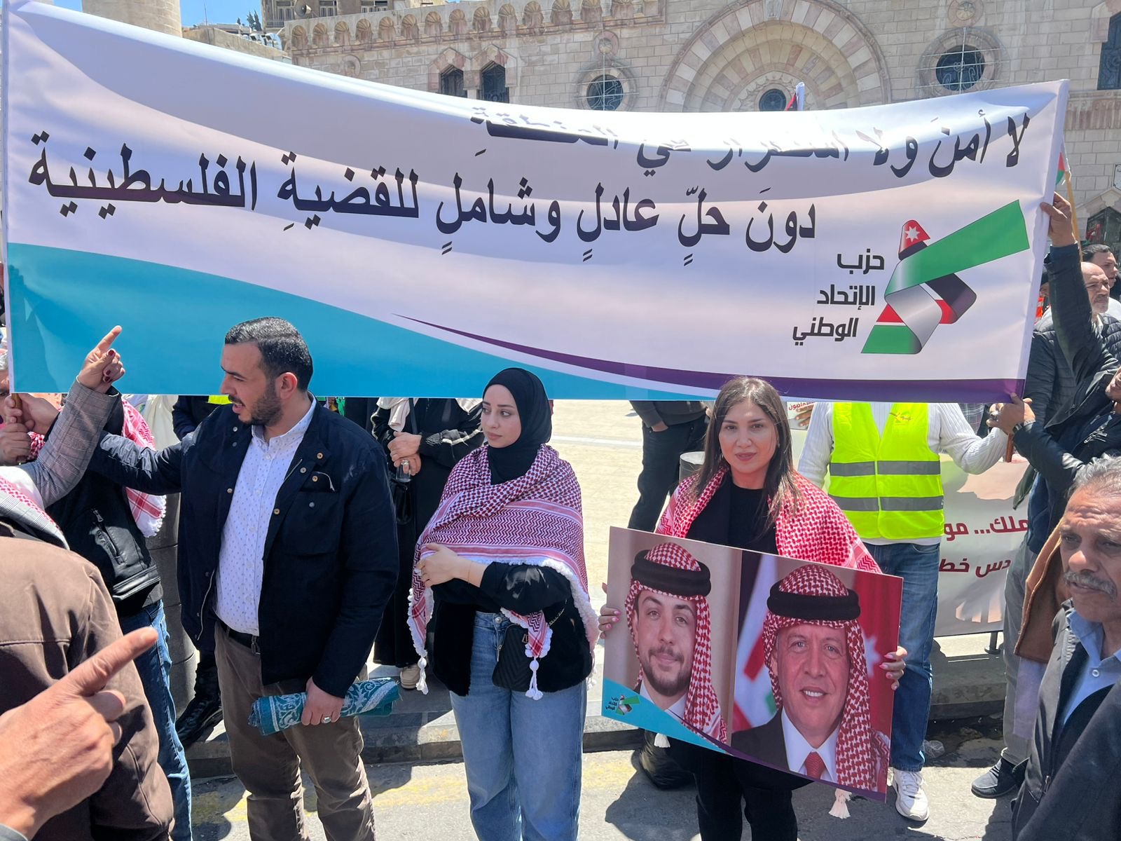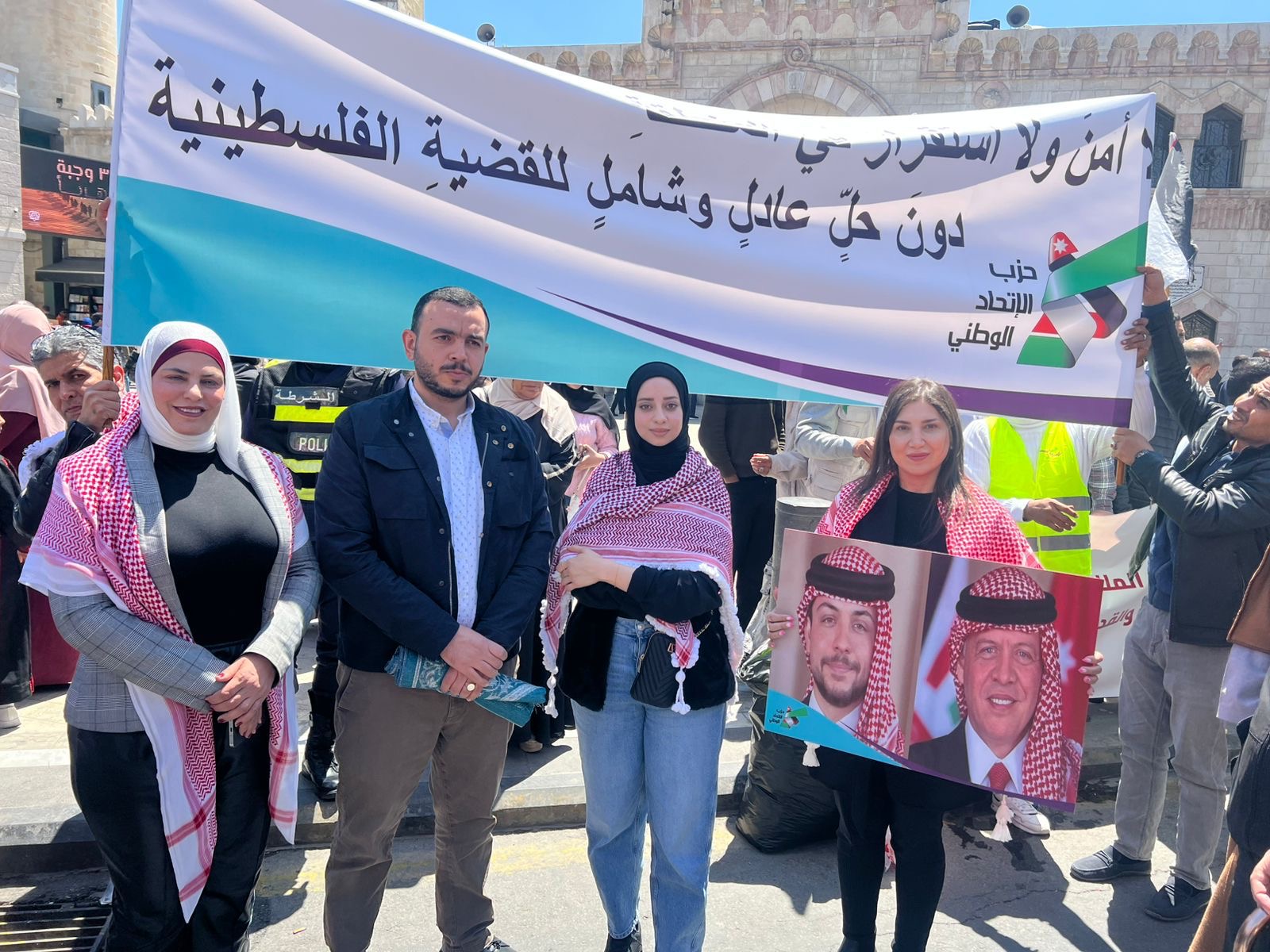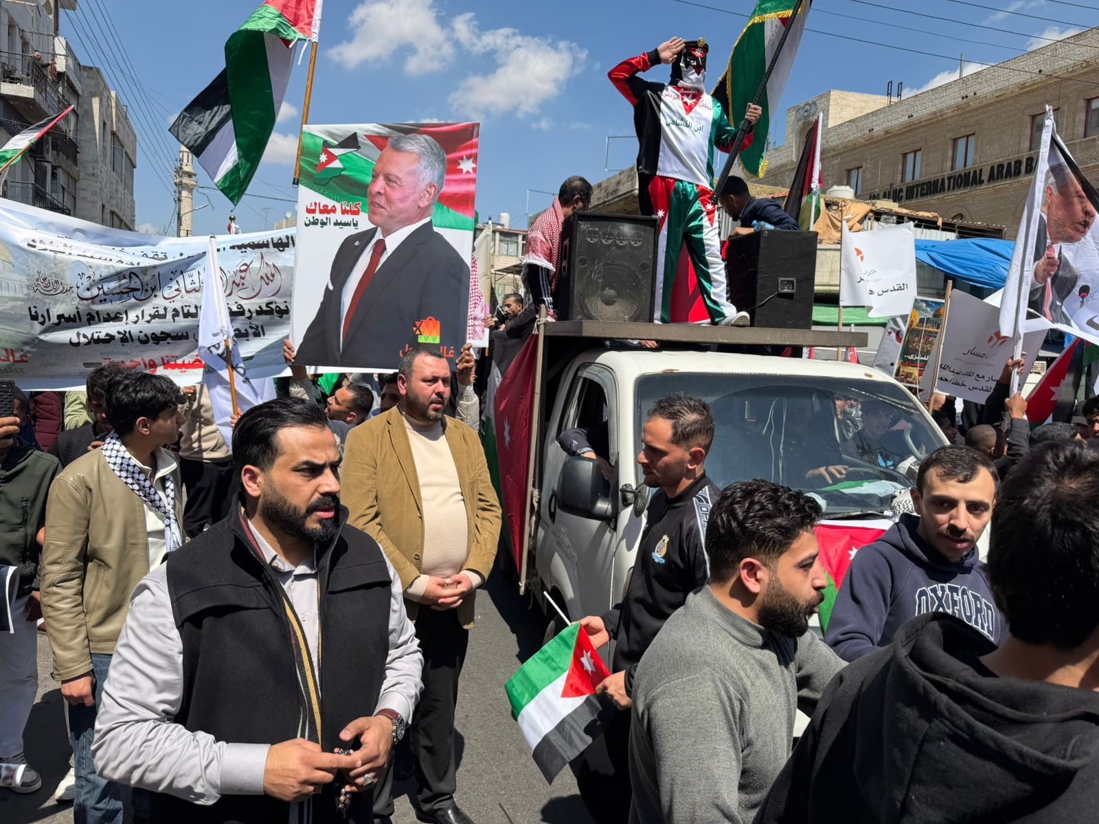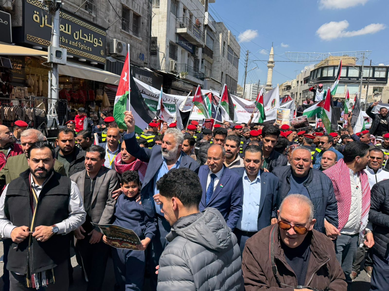 ورفع المشاركون خلال المسيرة شعارات تؤكد أن لا أمن ولا استقرار في المنطقة دون حل عادل وشامل للقضية الفلسطينية، في مشهد جسّد وحدة الموقف الشعبي والحزبي والوطني الأردني، ورسّخ رسالة واضحة بأن الأردن سيبقى ثابتًا في دعمه لفلسطين، وفي رفضه لكل مشاريع الاحتلال وعدوانه وتشريعاته الباطلة.