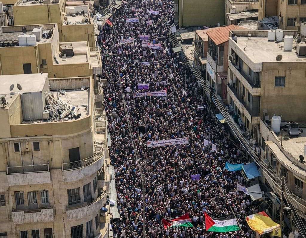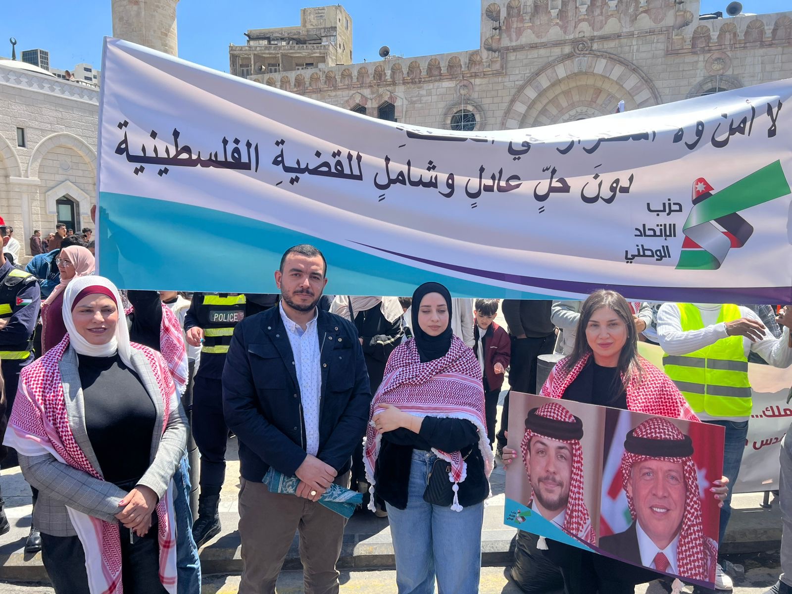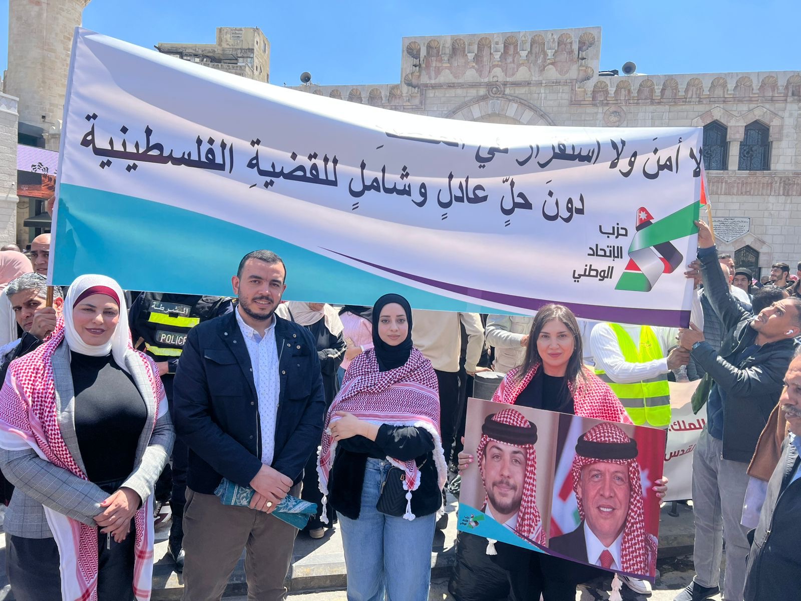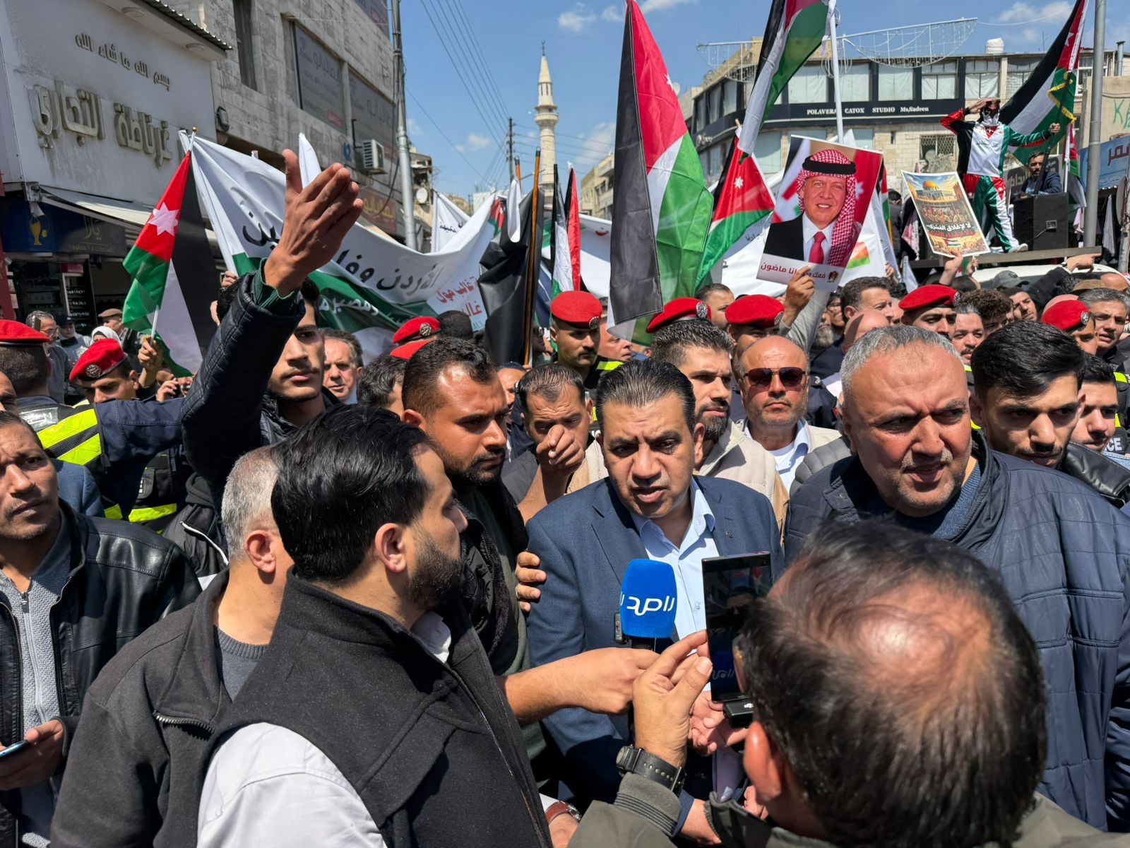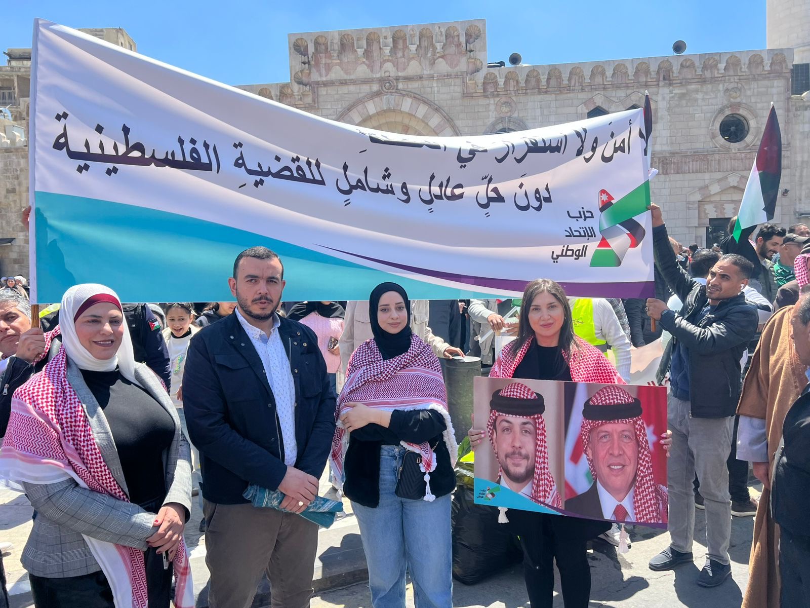 ورفع المشاركون خلال المسيرة شعارات تؤكد أن لا أمن ولا استقرار في المنطقة دون حل عادل وشامل للقضية الفلسطينية، في مشهد جسّد وحدة الموقف الشعبي والحزبي والوطني الأردني، ورسّخ رسالة واضحة بأن الأردن سيبقى ثابتًا في دعمه لفلسطين، وفي رفضه لكل مشاريع الاحتلال وعدوانه وتشريعاته الباطلة.
