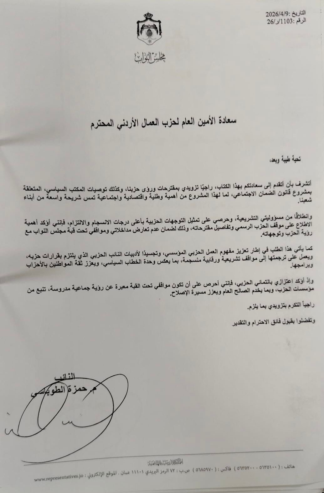 عمان جو- طالب النائب حمزة الطوباسي حزب العمال الأردني بتزويده بمواقف الحزب بما يخص قانون الضمان الاجتماعي للانسجام معها تحت القبة لتجنب أي تعارض. وتاليا الوثيقة: