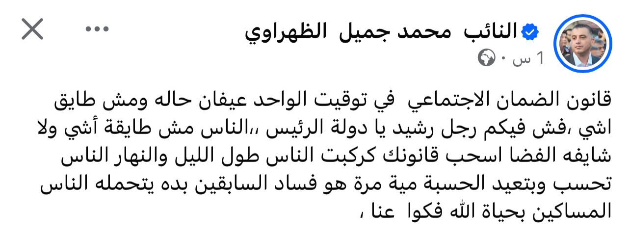 وقال الظهراوي عبر صفحته الشخصية على فيس بوك: قانون الضمان الاجتماعي في توقيت الواحد عيفان حاله ومش طايق اشي ،فش فيكم رجل رشيد يا دولة الرئيس ،الناس مش طايقة أشي ولا شايفه الفضا اسحب قانونك كركبت الناس طول الليل والنهار الناس تحسب وبتعيد الحسبة مية مرة هو فساد السابقين بده يتحمله الناس المساكين بحياة اللّٰه فكوا عنا