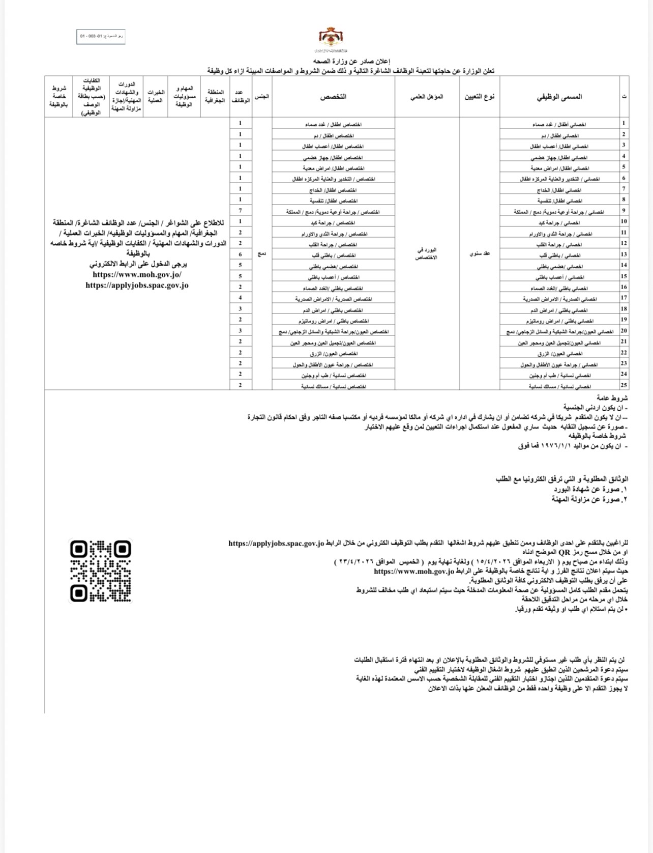 ودعت الوزارة الراغبين بالتقدم إلى ضرورة استيفاء الشروط العامة، والتي تتضمن أن يكون المتقدم أردني الجنسية، وألا يكون مرتبطًا بأي التزامات وظيفية أو قانونية تعيق التعيين.